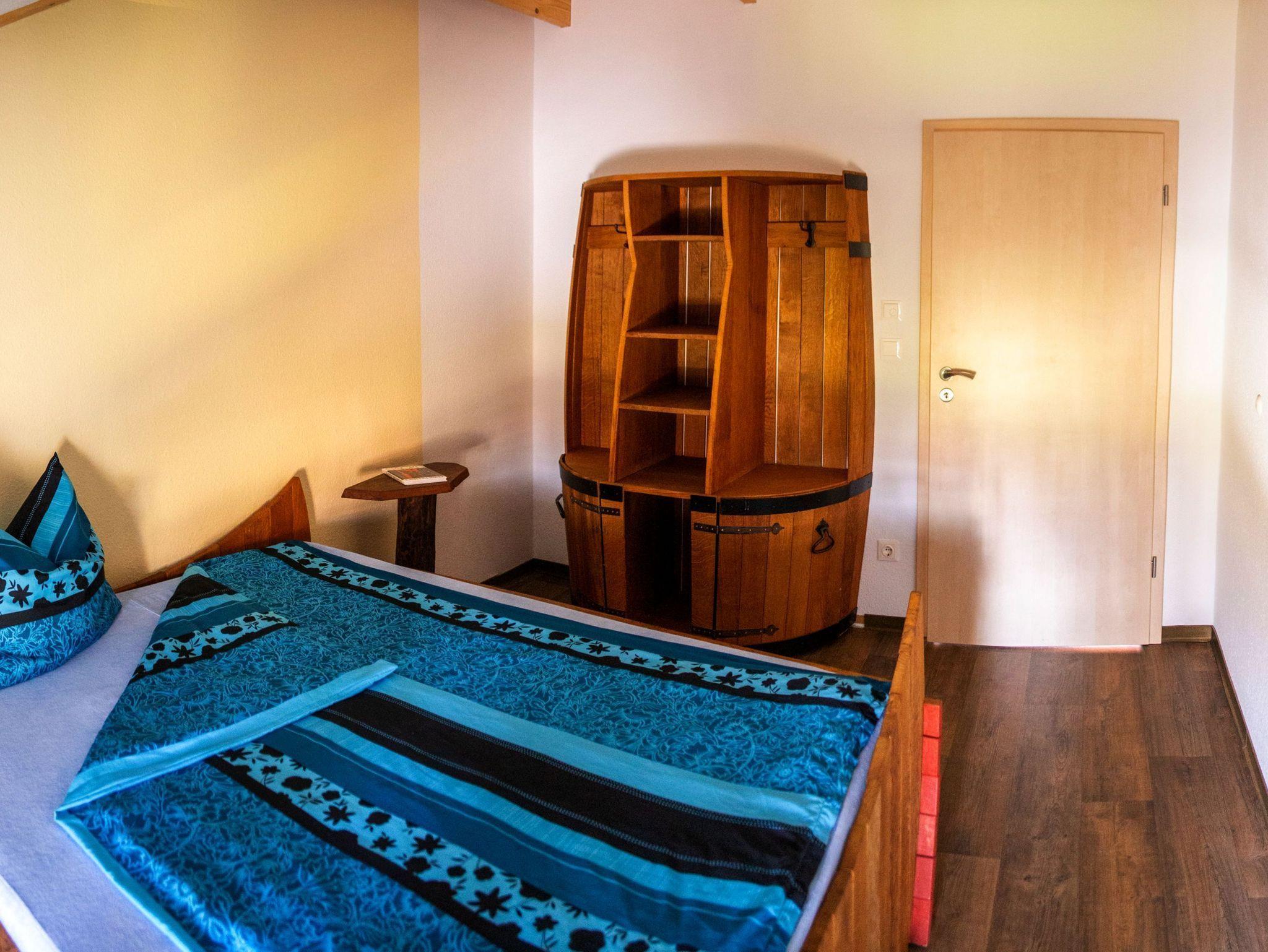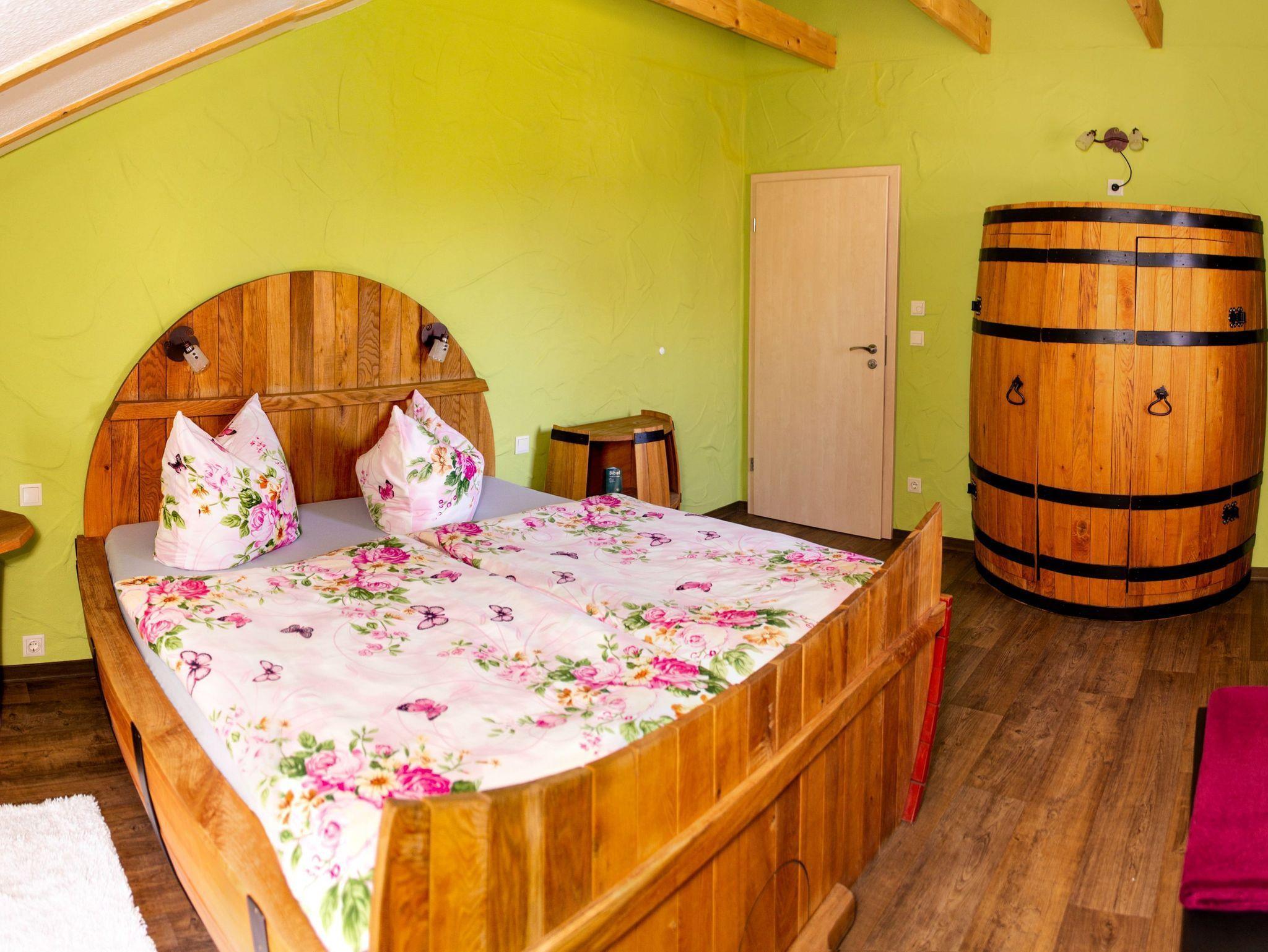 Schlafzimmer mit Schlafen mal anders im Weinfass, in allen Betten sind hochwertige Matrazen und die Doppel-Betten sind 2,00 m lang und 1,80 m breit; Kleiderschrank