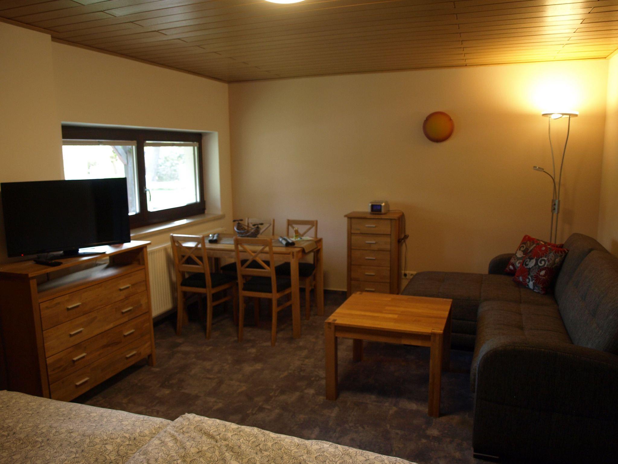 Die Wohnung ist mit einem gemütlichen Wohn-Schlafbereich mit Essecke, gemütlicher Couch und Doppelbett ausgestattet.
