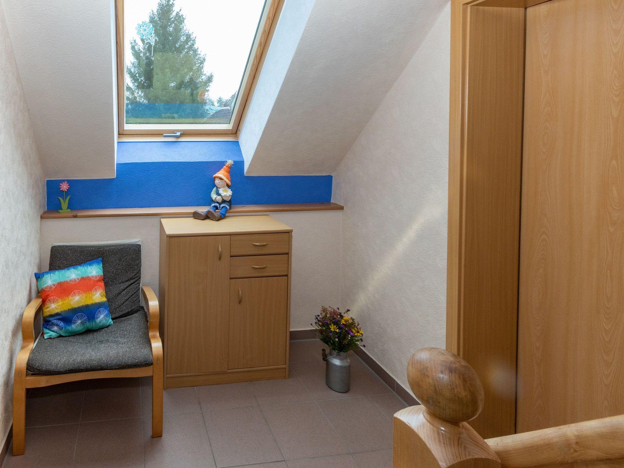Die Ferienwohnung befindet sich im 1. OG und verfügt über einen komb. Wohn/Schlafraum mit Küchenzeile und ein Bad mit DU/WC. Ab 3 Personen kann im Dachgeschoss ein zusätzlicher Schlafraum genutzt werden.