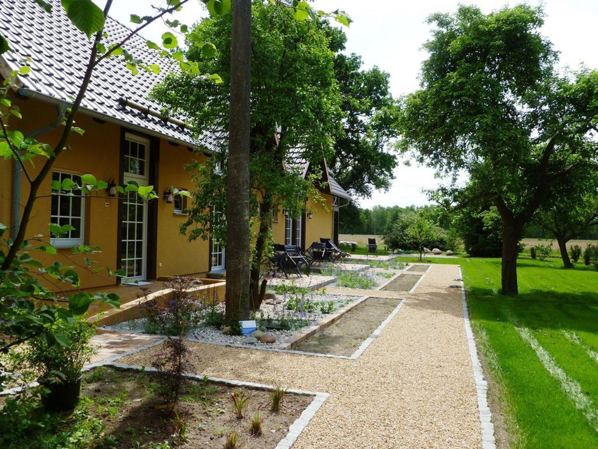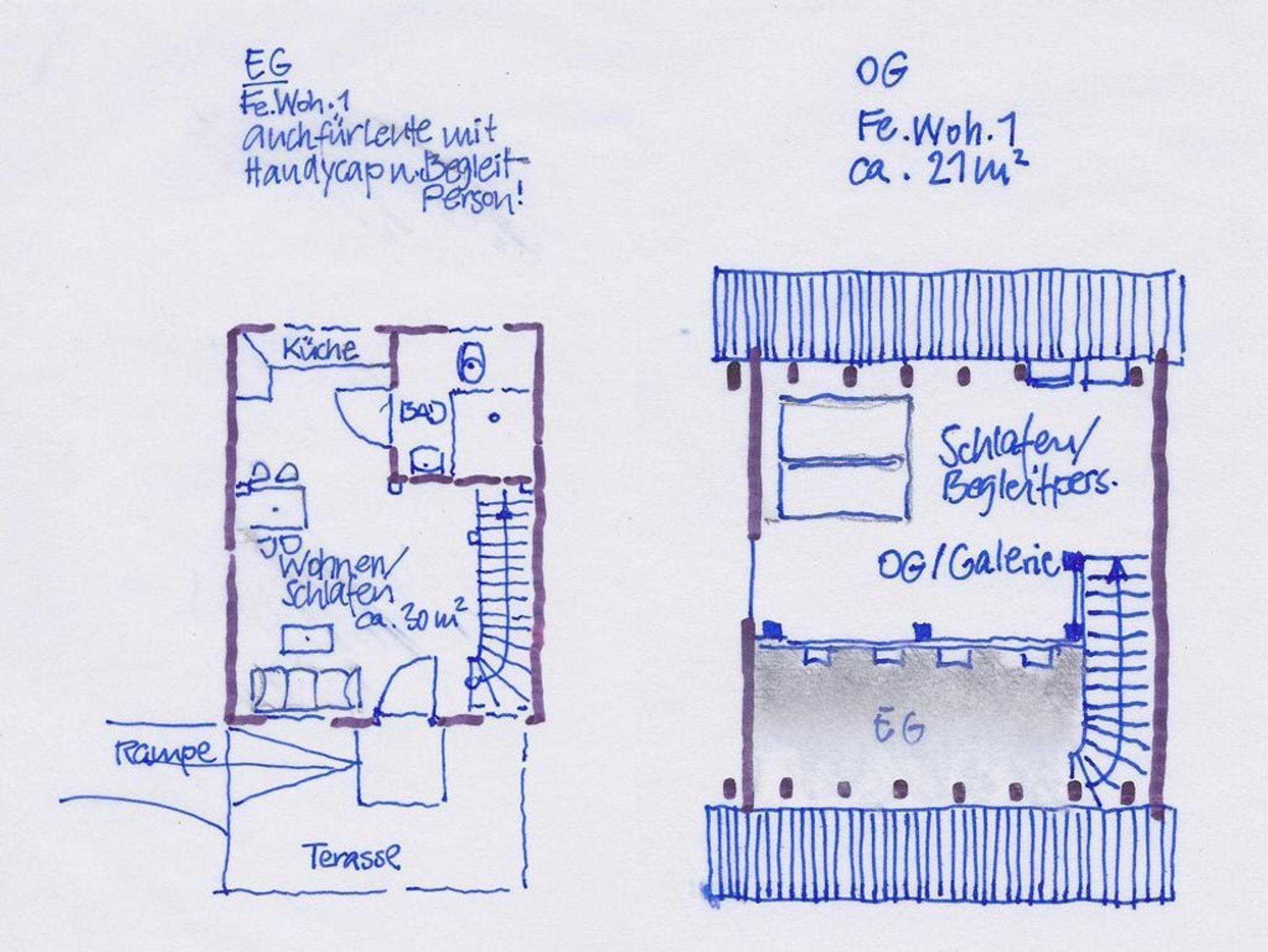 Die Ferienanlage Froschkönig liegt auf einem großen gepflegten Grundstück. In der Ferienwohnung 1 befindet sich im Erdgeschoss der Wohnraum mit gemütlicher Sitzecke, Essplatz und Küchenzeile sowie das Bad mit DU/WC. Das Erdgeschoss ist barrierefrei gestaltet. Der Schlafbereich mit Doppelbett ist auf der offenen Galerie untergebracht. Zur Ferienwohnung gehört eine Terrasse mit Gartenmöbeln umgeben von wunderschönen alten Bäumen.