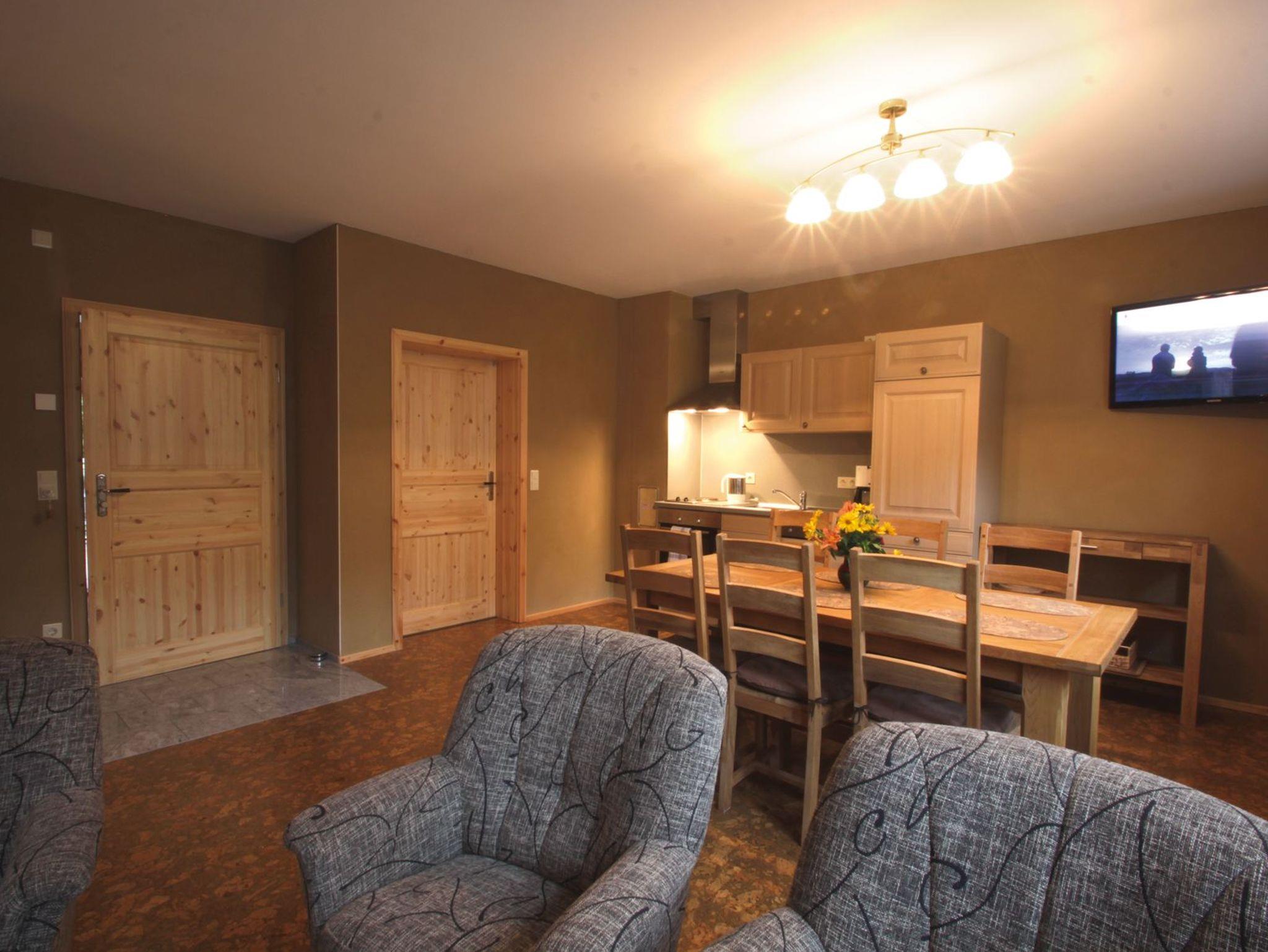 Große Ferienwohnung im EG im Ferienhaus Backhaus. Die Ferienwohnung verfügt über einen großen Wohnraum mit Küchenzeile, zwei Schlafräumen (eins mit Doppelbett, eins mit Doppelbett und Etagenbett) und einem Bad mit DU/WC. Die Ferienwohnung ist mit Lehmputz und Korkfußböden gut für Allergiker geeignet.