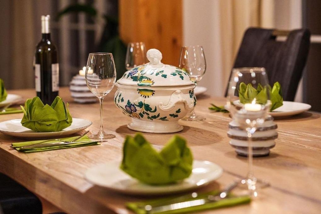 Die Küchenkombination ist modern und die Küche ist vollausgestattet. Es gibt drinnen und draußen einen großen Esstisch, die gerne auch für Spiele genutzt werden.