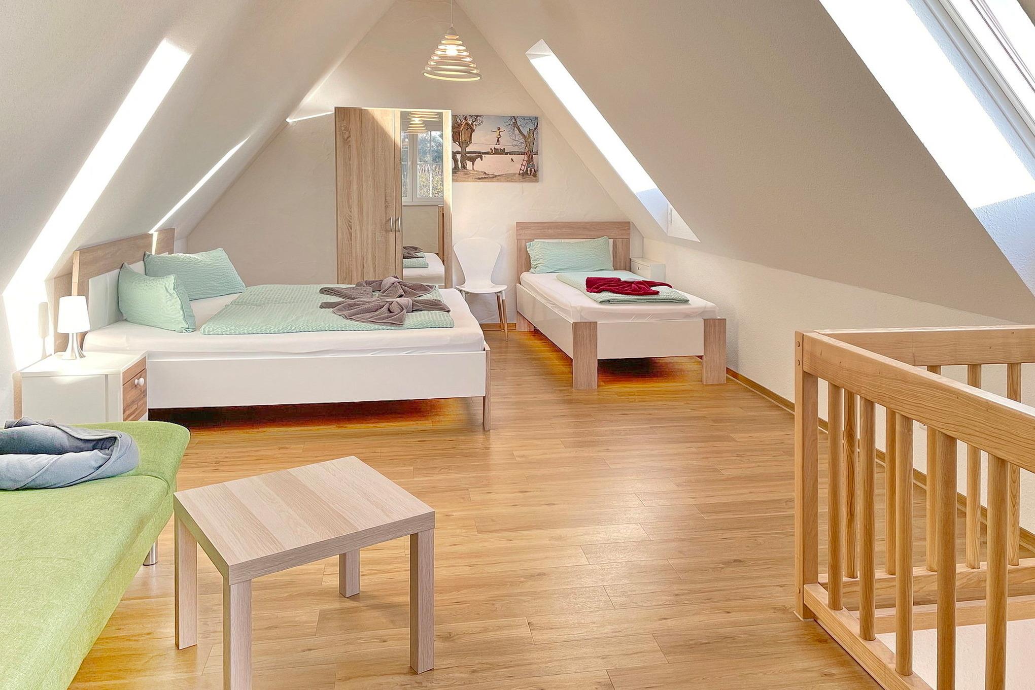 Die Ferienwohnung "Luftschloss" bietet auf 60 m² Platz für bis zu 5 Personen. Sie befindet sich in der 1. Etage des Hauses "Zum Baumhaus" und verfügt über 2 gemütliche Schlafzimmer sowie ein Badezimmer. Zur Ausstattung gehören unter anderem ein Internet-WLAN und ein Geschirrspüler, um den Aufenthalt so bequem wie möglich zu gestalten. Im Garten können Sie entspannen und die Natur genießen.