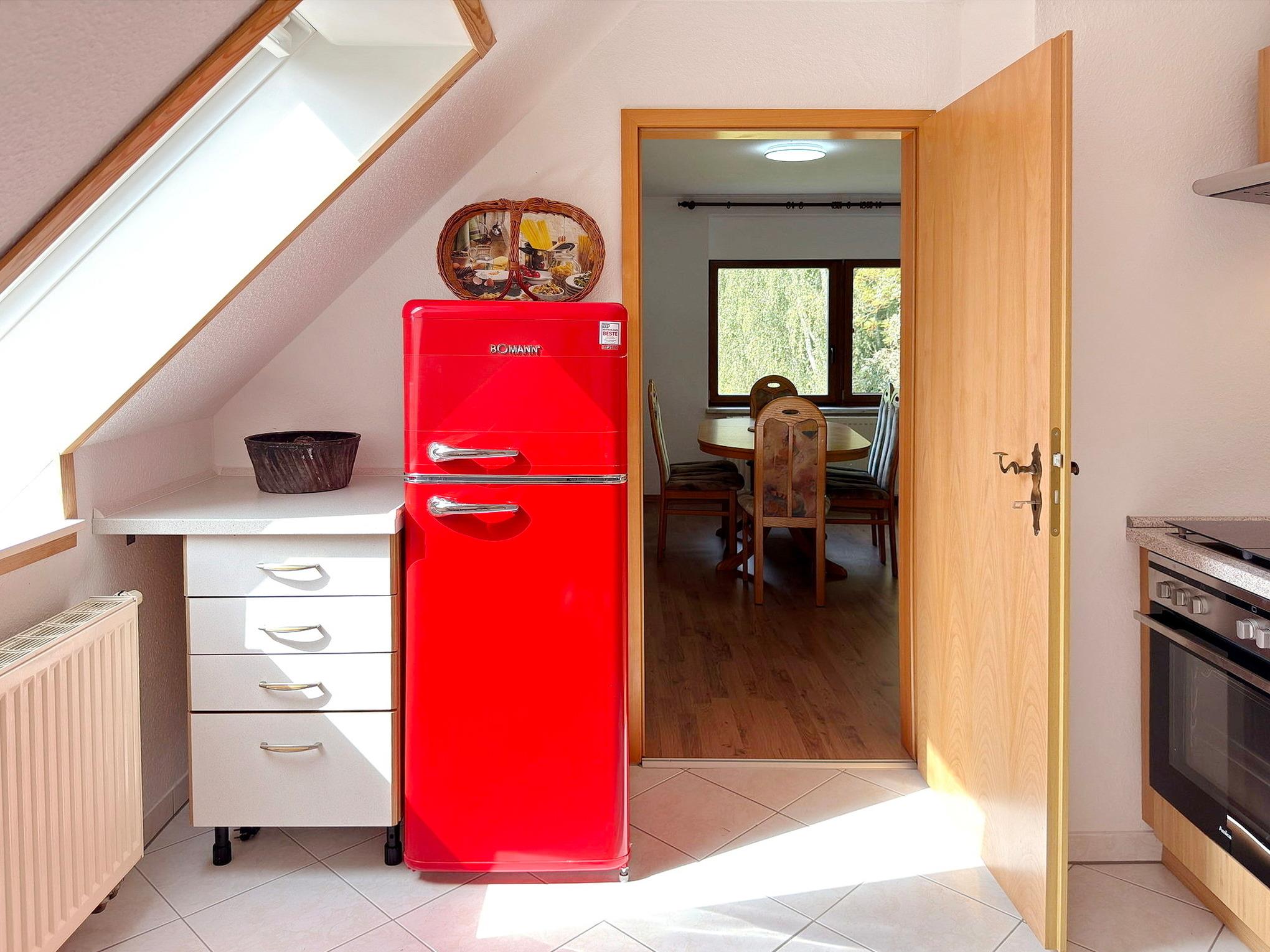 Die separate Küche ist vollständig ausgestattet, der Esstisch lädt zu langen Runden ein. Auf Terrasse und im Garten kommt die Natur ganz nah, der Fließ vor der Haustür macht Lust auf Paddeltouren.