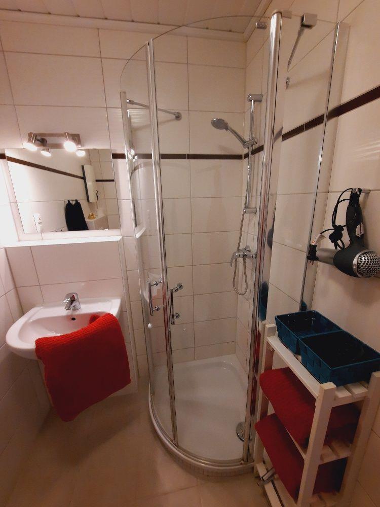 Eckdusche mit Glastüren, Handtuchheizkörper, gute Beleuchtung, viele Aufhängemöglichkeiten und Ablagen, Fön, klappbarer Wäscheständer