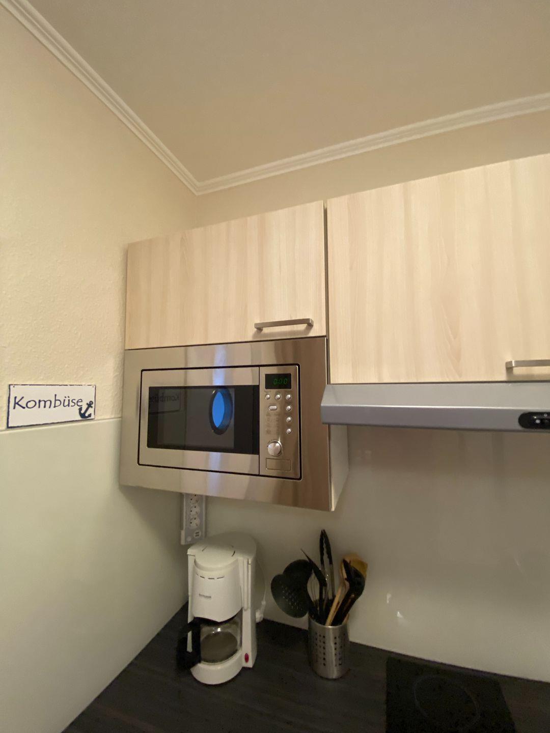 Kühlschrank, Spülmaschine, Mikrowelle mit Grill, Filterkaffeemaschine, 2er Cerankochfeld, Toaster, Wasserkocher, Eierkocher und eine umfangreiche Ausstattung mit Gläsern, Geschirr und Küchenutensilien