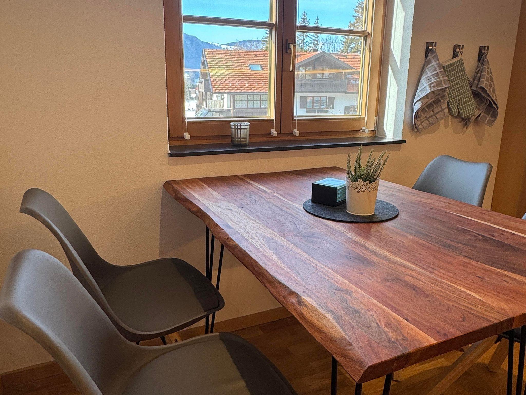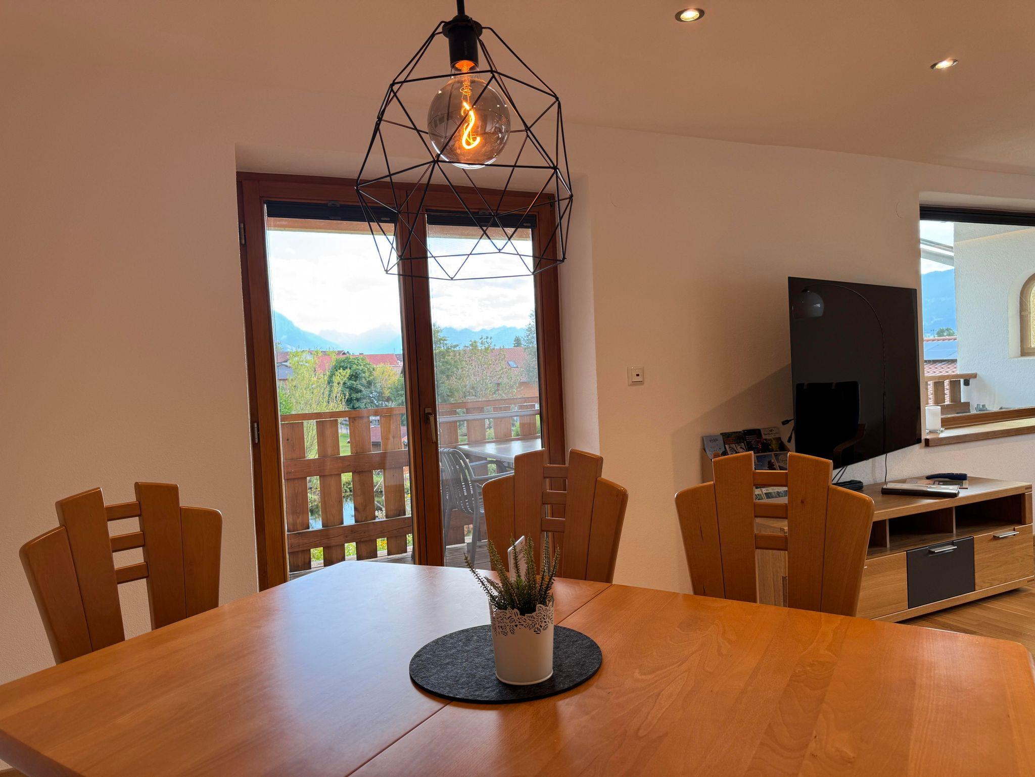 Im geräumigen Wohnzimmer findet ihr einen großen Esstisch, eine gemütliche Couch und einen Smart-TV. Flyer und Infomaterial zu Wanderungen, Radtouren, Restaurants und Erlebnissen in der Region stellen wir euch hier auch zur Verfügung. Von hier gelangt ihr auch auf den Balkon mit Essbereich, Liege und Elektrogrill.