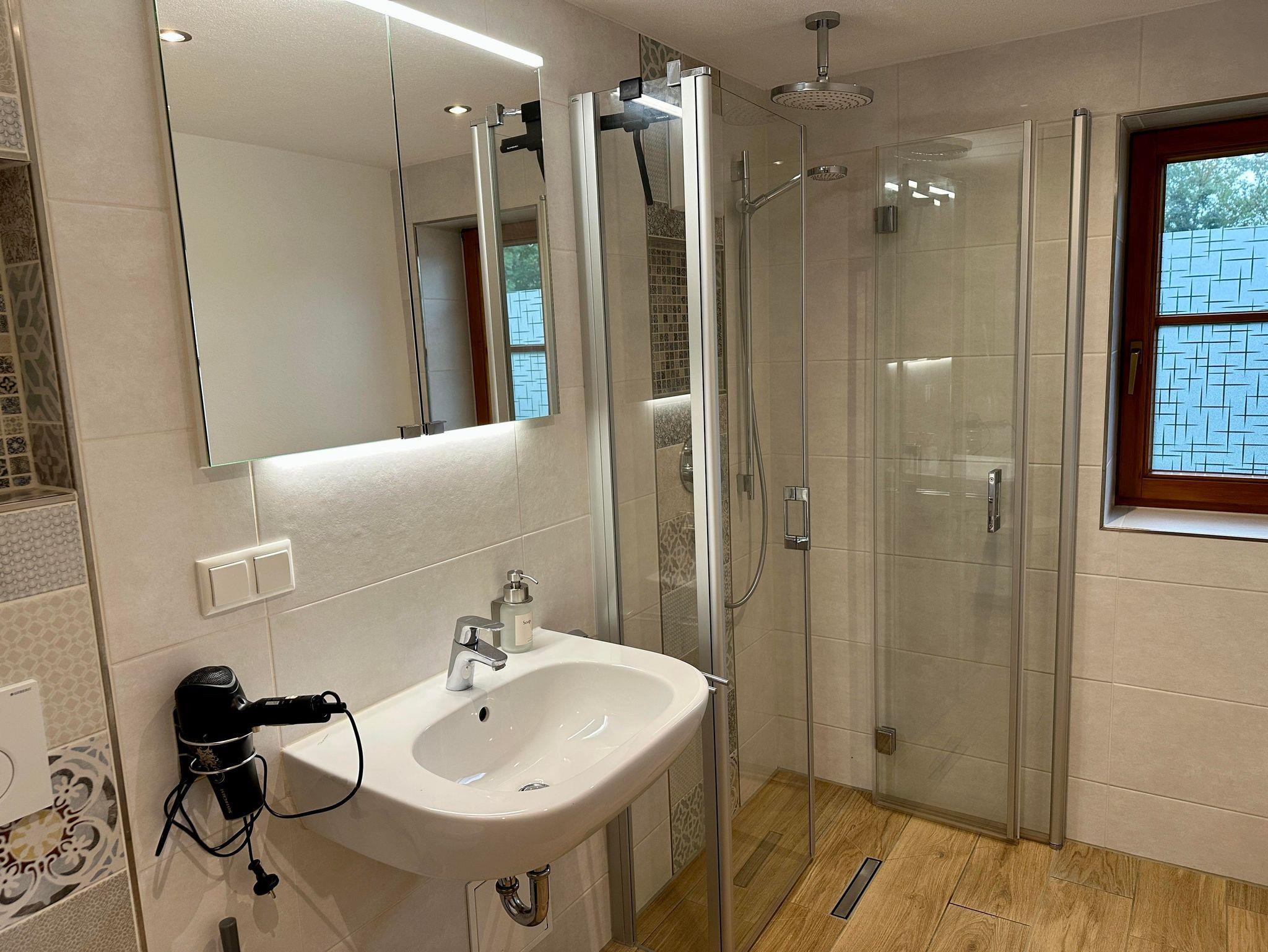 Das moderne Bad verfügt über Toilette, Waschbecken, Spiegelschrank, begehbare Dusche, Handtuchwärmer, Mülleimer, Föhn und Badhocker. Toilettenpapier und Handtücher werden euch gestellt und sind im Preis enthalten.