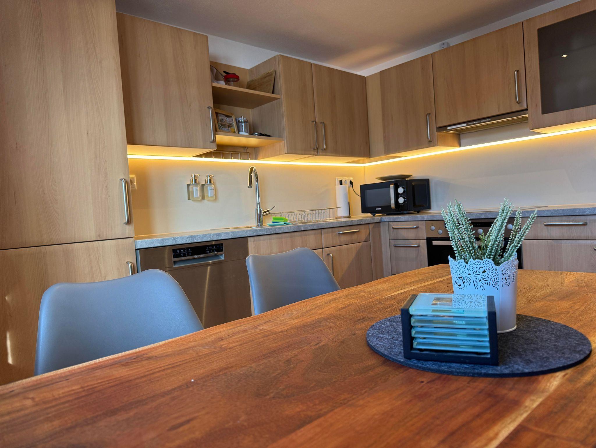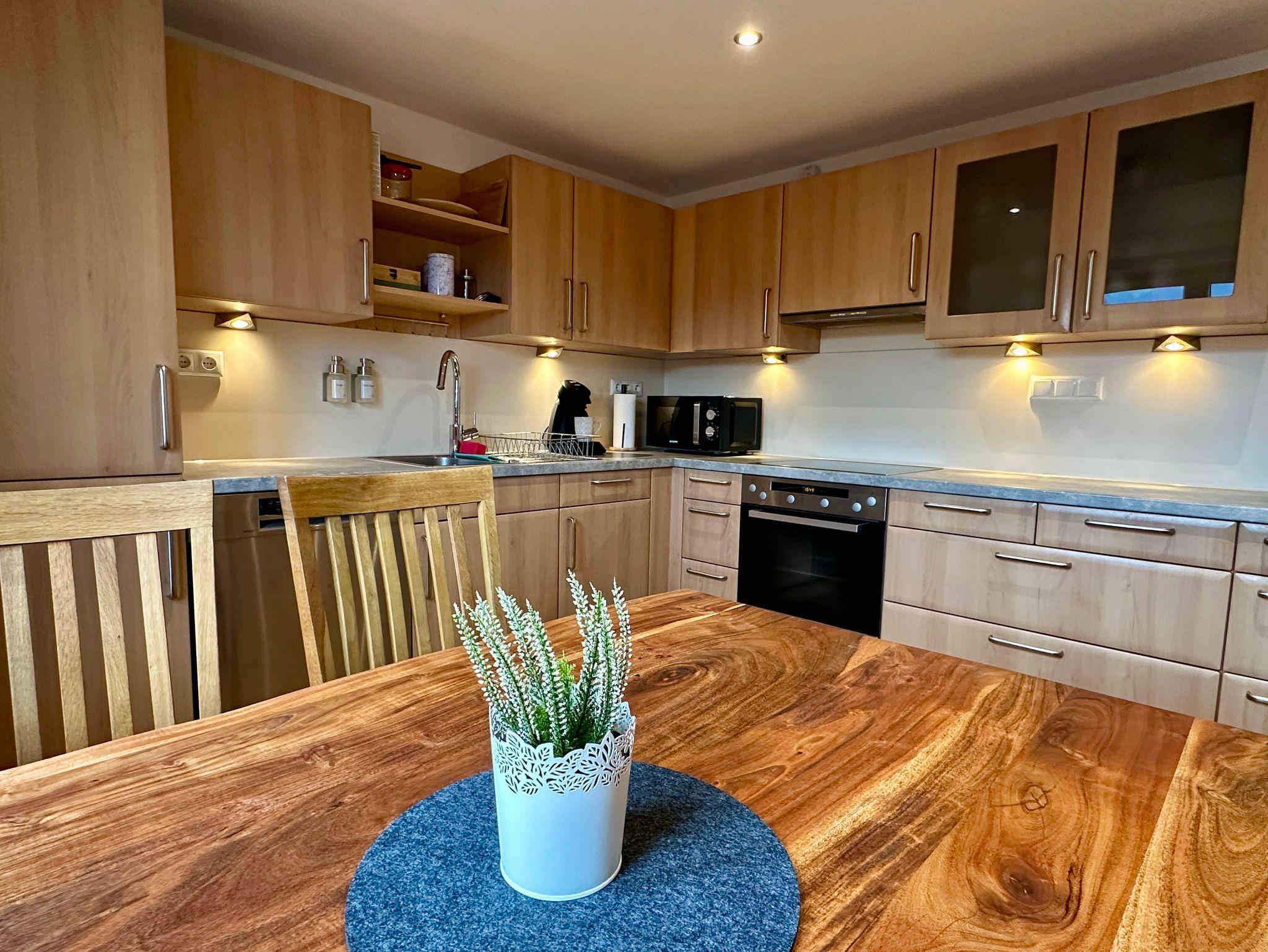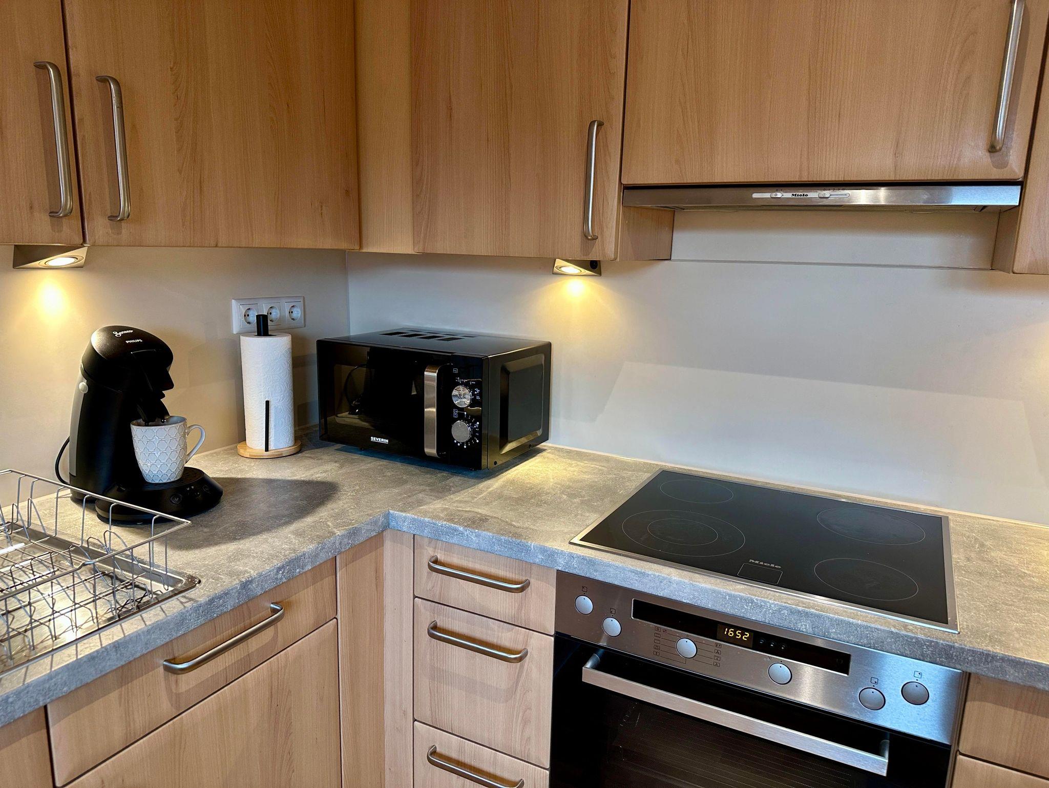Zudem bieten wir euch eine voll ausgestatte Küche mit Herd, Backofen, Spülmaschine, Kühlschrank, Gefrierschrank, Mikrowelle, Wasserkocher, Toaster, Eierkocher, Senseo-Kaffeemaschine und Filterkaffeemaschine, allen möglichen Kochutensilien und Geschirr/Gläser, Müllbeutel, Putzlappen, Zewarolle, etc. Zum Start erhaltet ihr auch etwas Kaffee, Tee, Salz, Pfeffer, Essig und Öl. Ein kleiner Essbereich rundet die Küche ab.