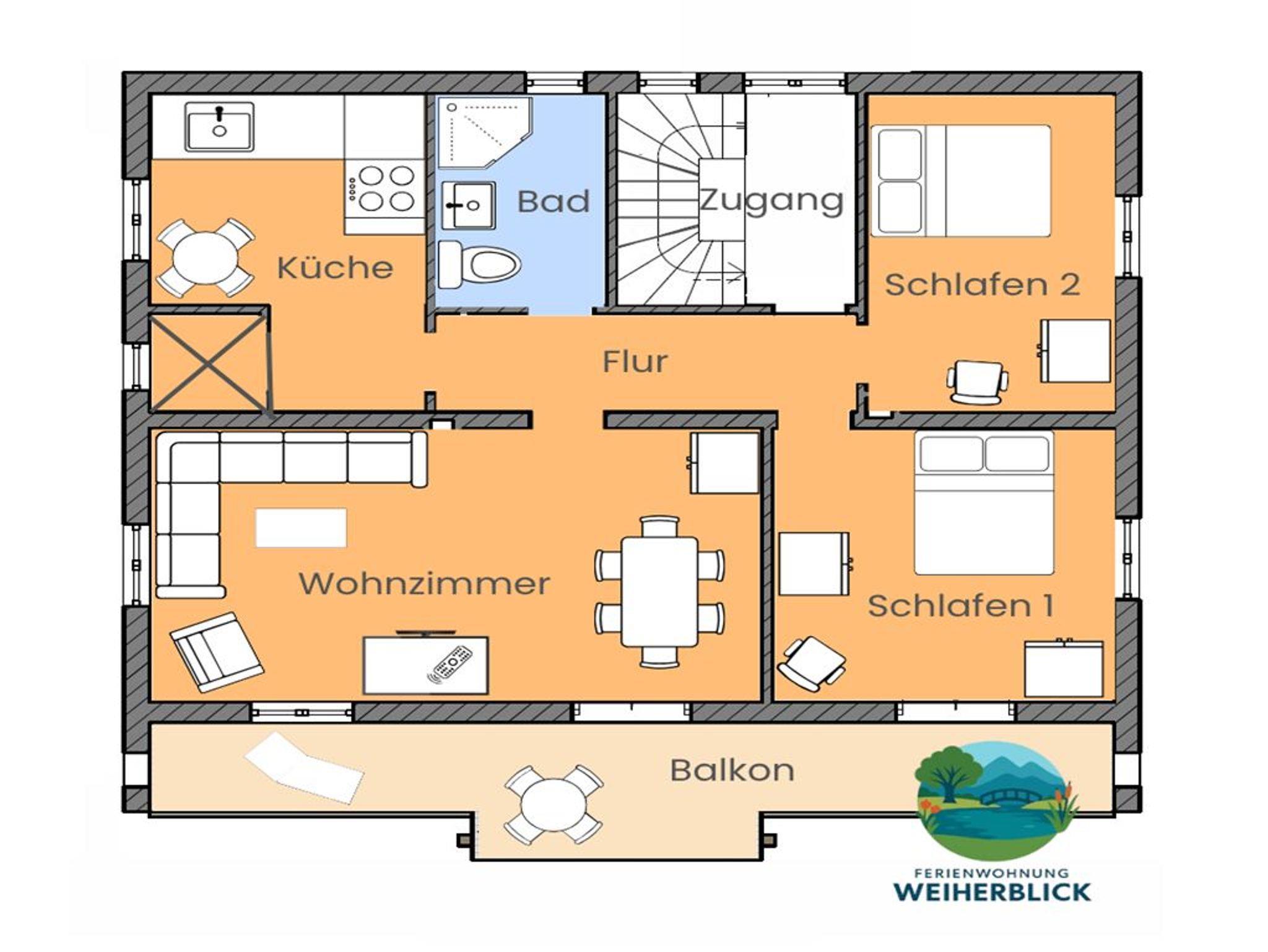 In der 93 m² großen, hellen Ferienwohnung Weiherblick im 1.OG eines 3 Parteienhauses finden bis zu 4 Personen plus 1 Baby von 0-3 Jahre (in Babybett 120x60cm) Platz (Reisebett im Kinderpaket enthalten + (von 0-3 Jahre) Hochstuhl/Sitzerhöhung, Windeleimer mit Tüten, Tritthocker, Töpfchen und Wickelaufsatz auf Anfrage gegen eine einmalige Gebühr - 25€.