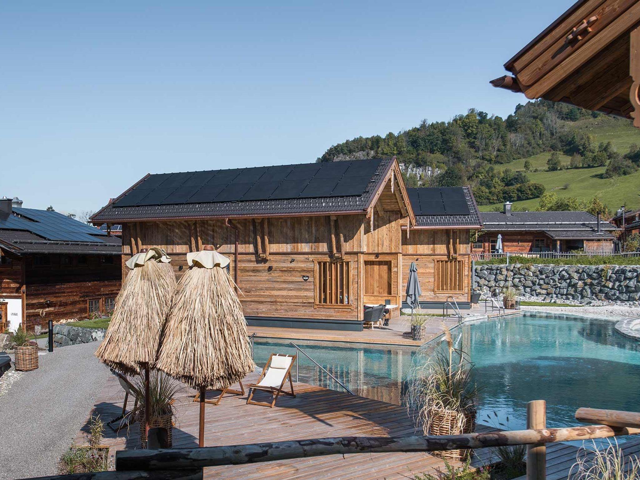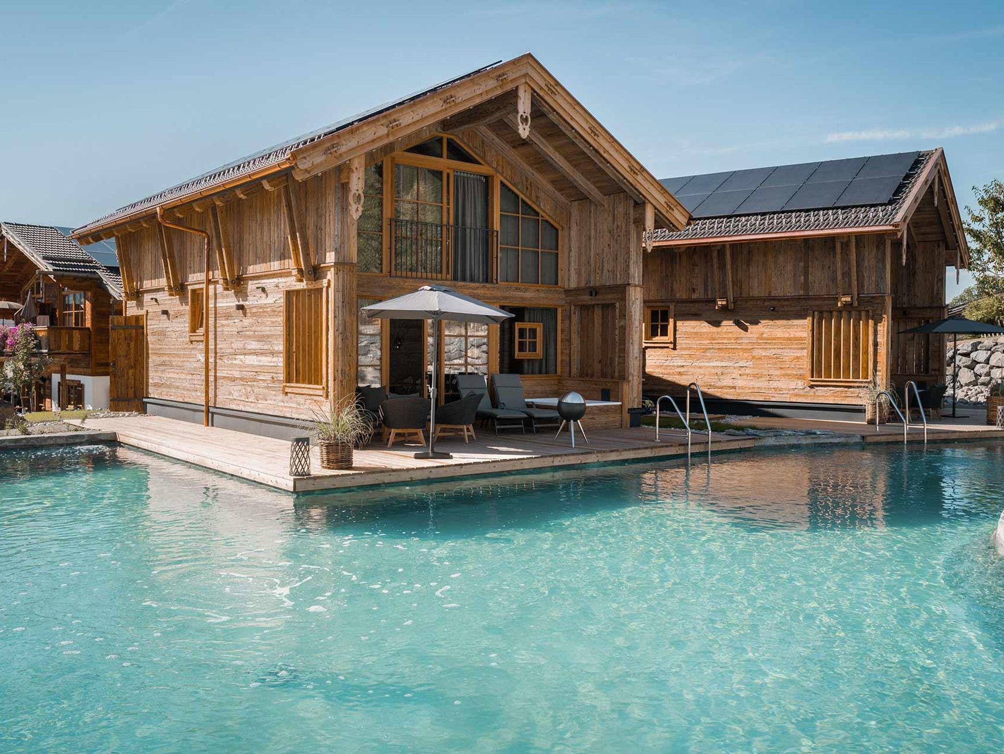 Alle neuen Chalets mit Alpzitt-Besonderheiten und eigenem Whirlpool auf der Terrasse – plus Pool, Naturbadesee & neues Spa-Gebäude.
