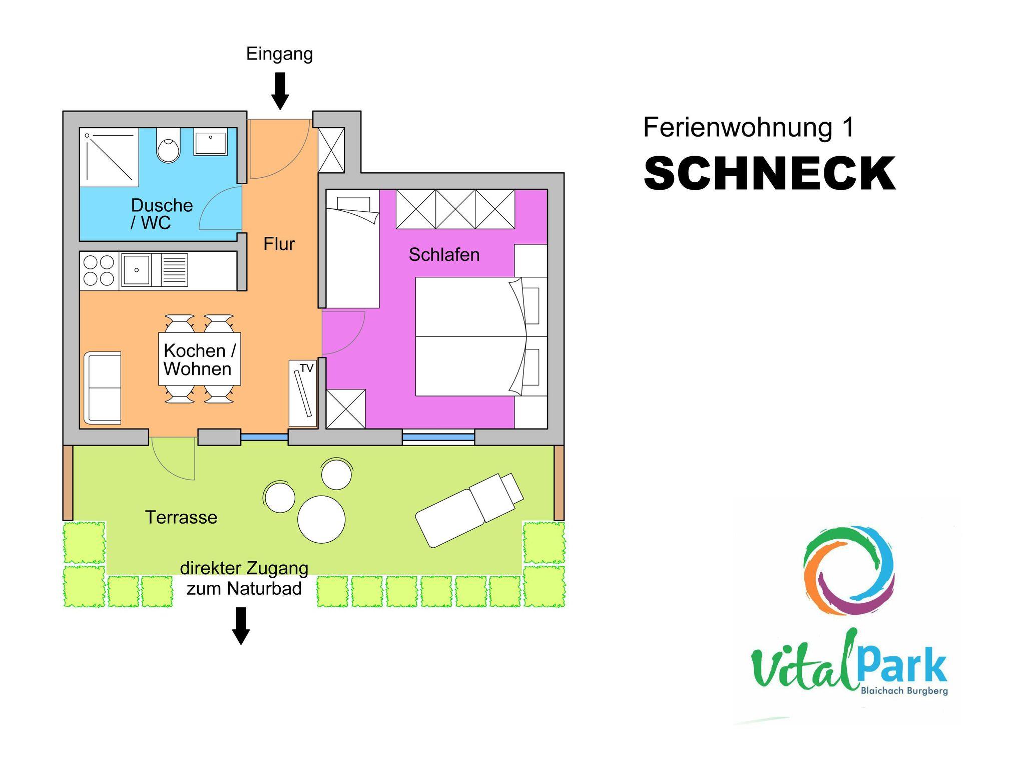 Die Wohnung hat ein abgetrenntes Schlafzimmer, einen stilvoll eingerichteten Wohn- & Essbereich mit Küchenzeile sowie ein helles Bad mit Dusche und WC. Im Wohnraum befindet sich eine einladende Couch sowie Sat-TV. Zusätzlich eine große Terrasse mit Zugang zum Vital-Park.