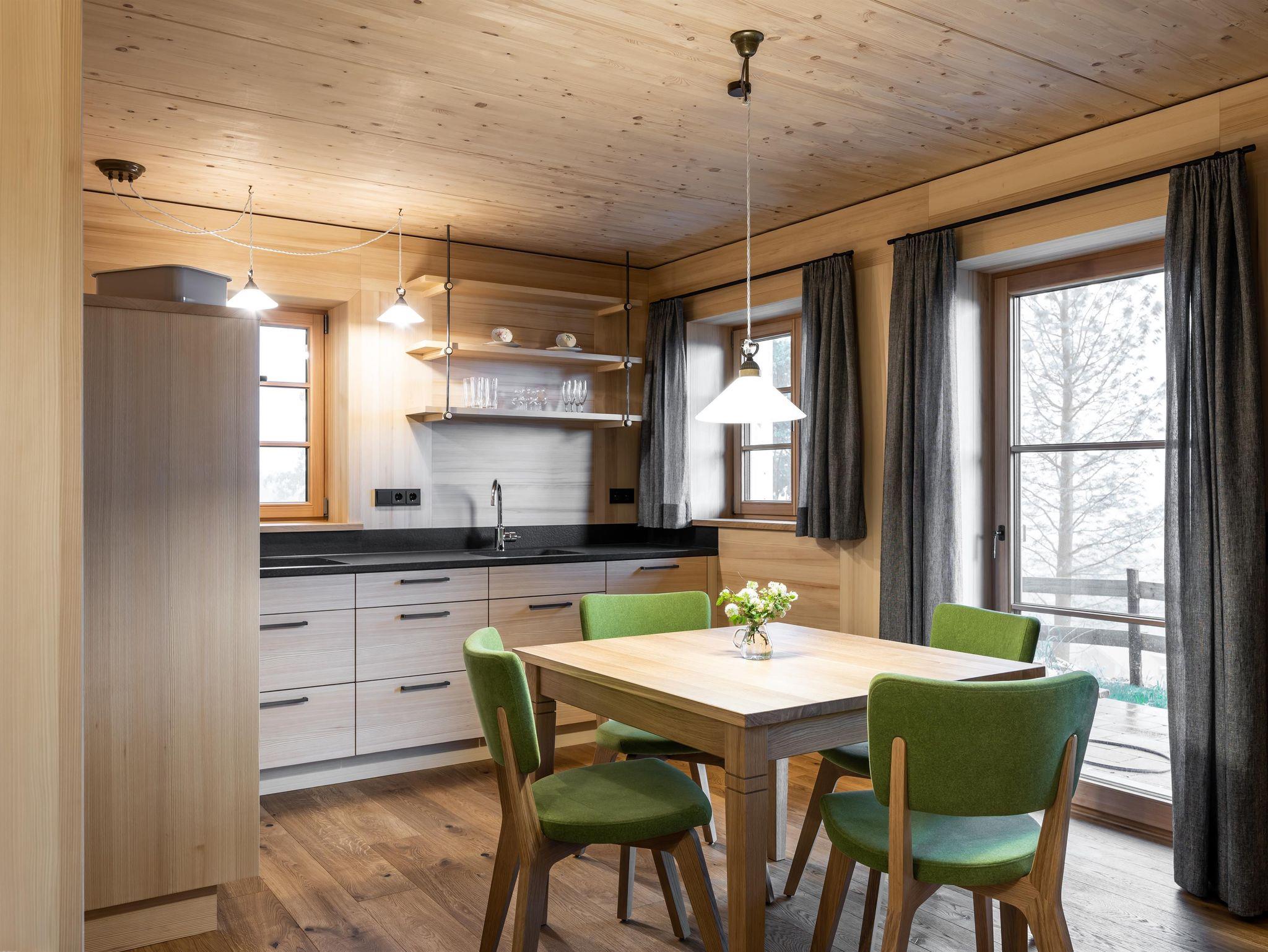 Alle Chalets sind ausgestattet mit einer hochwertigen Echtholzküche, die keine Wünsche offen lässt: Backofen & Mikrowelle, Geschirrspüler inkl. Tabs, Kühlschrank mit Gefrierfach, Wasserkessel inkl. Kaffee – und Teefilter, Wilde Gewürze, Spülmittel und Geschirrtücher. Einem Bad mit Regendusche, Handtuchtrockner, Kosmetikspiegel, Fön, Handtücher, Saunatücher & Bademäntel. Chalet Tanne und Eiche verfügen über eine eigene Saune. Alle Gäste im Chalet Lärche dürfen die Sauna im Haupthaus nutzen.