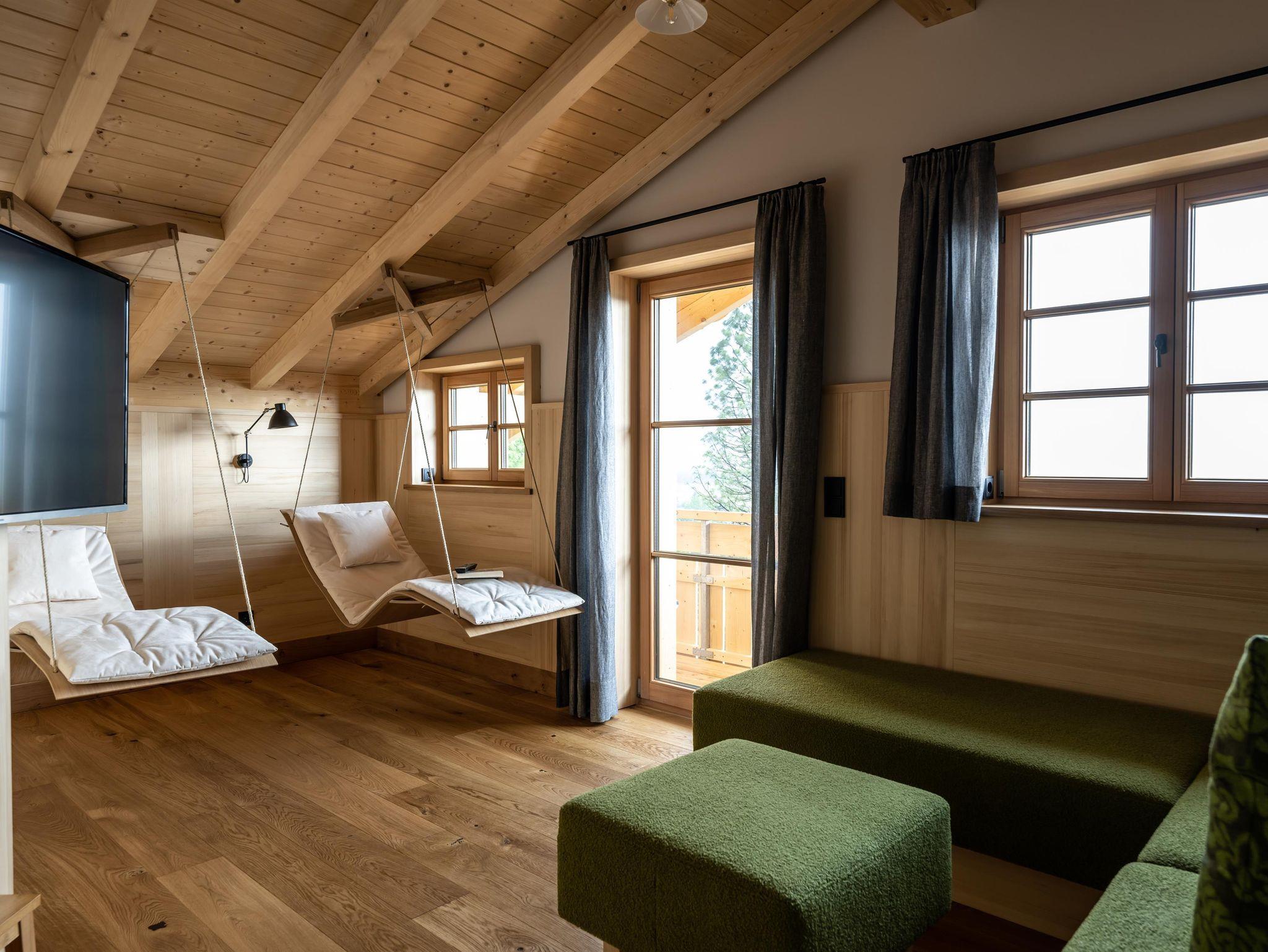 Mit über 100qm individuellem Refugium und hochwertigsten Naturmaterialalien wie Eichenholzböden, offenem Dachgebälk und Massivholzküche, sind die Chalets ideal für romantische Auszeiten oder einen erholsamen Familienurlaub, bei dem jeder seinen Rückzugsort finde und genießen darf.