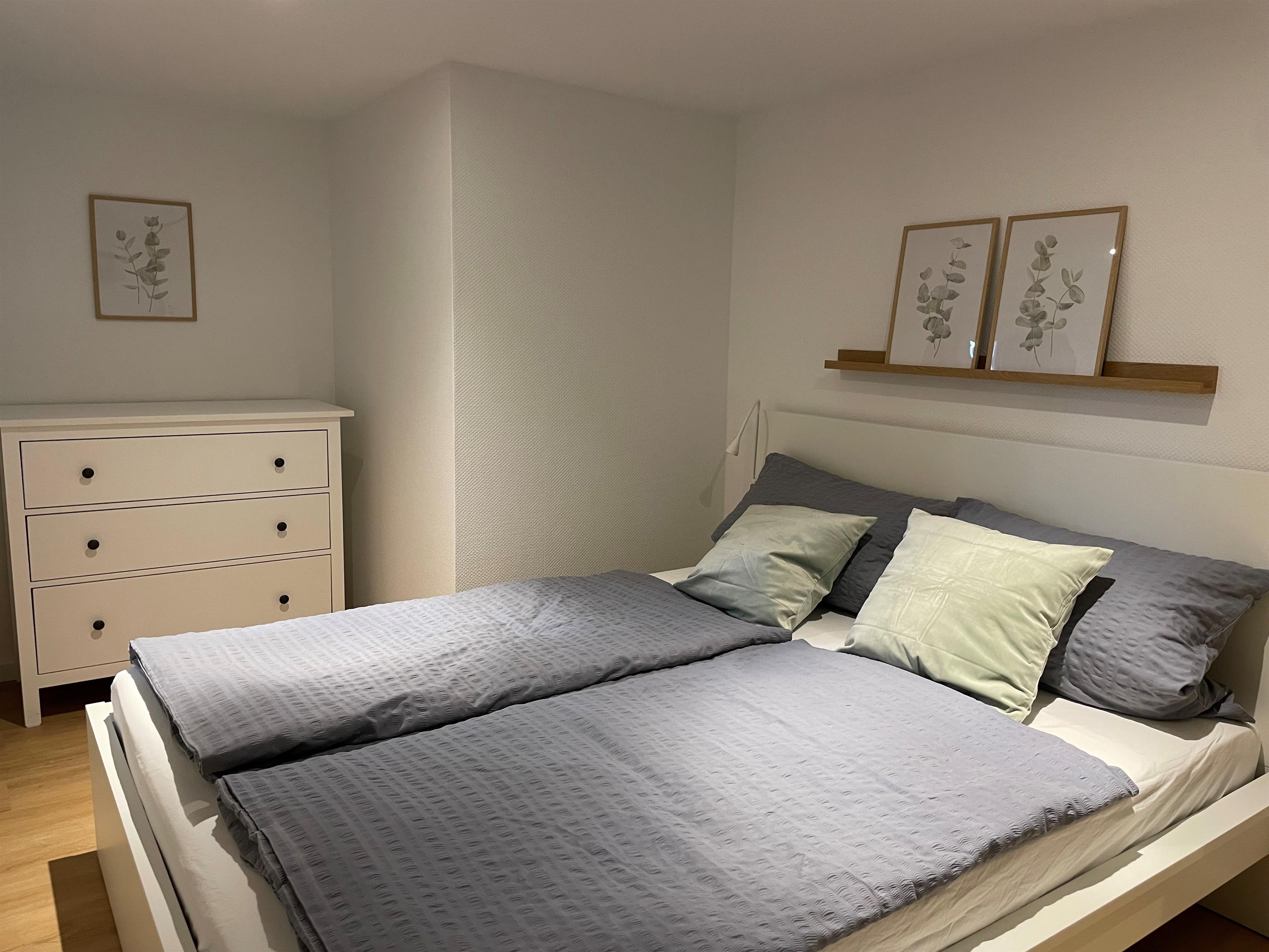 Eines der Schlafzimmer ist mit einem 1,60 m breiten Doppelbett ausgestattet und verfügt zusätzlich über eine kleine Kommode. Garderobenhaken sowie ein Wandspiegel stehen ebenfalls zur Verfügung.
