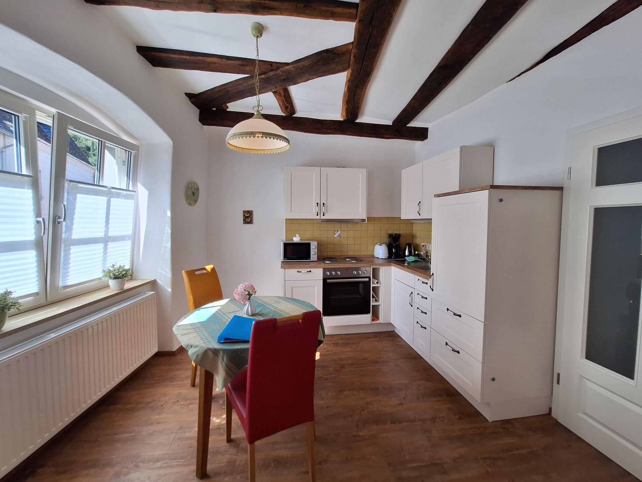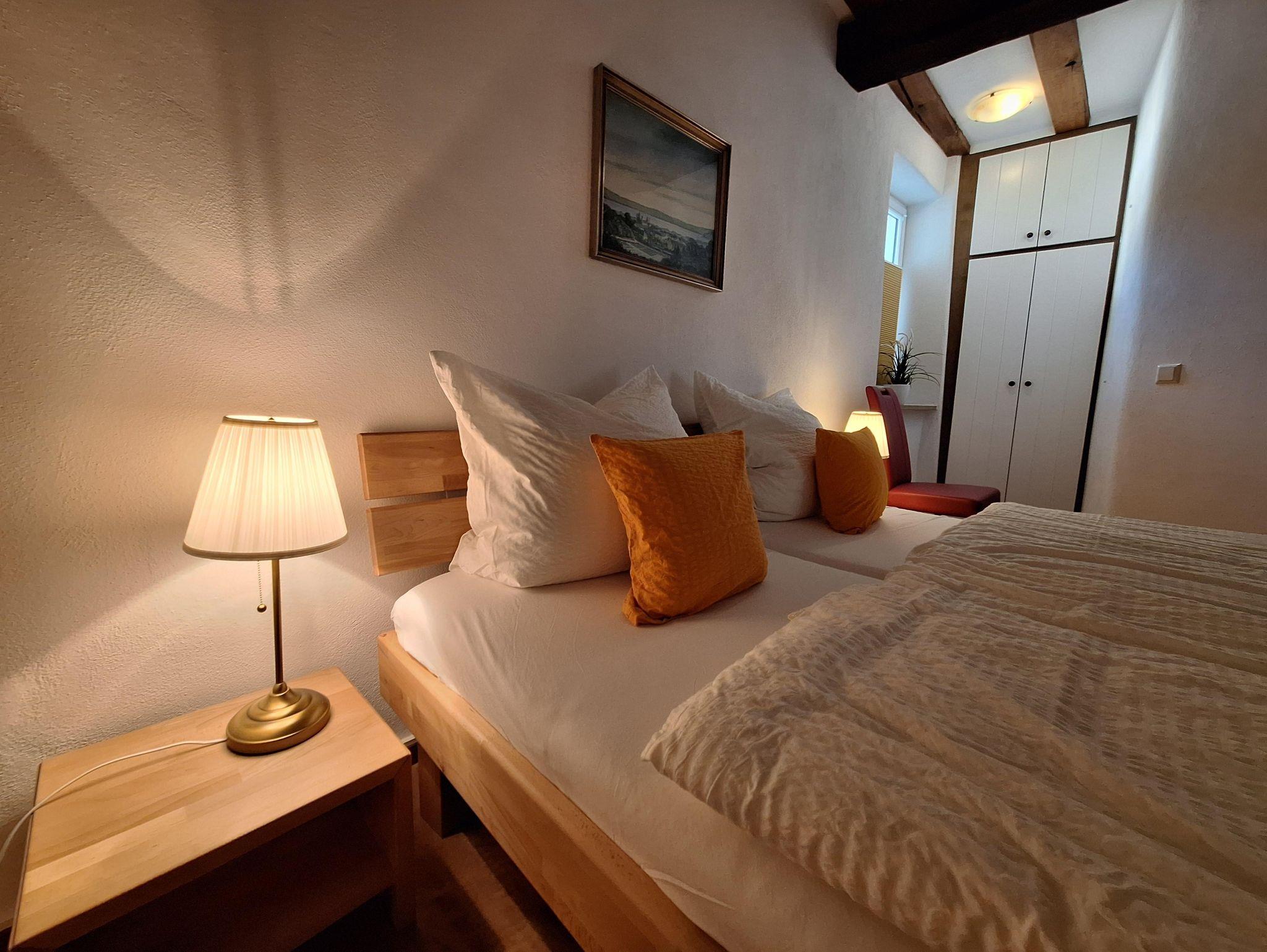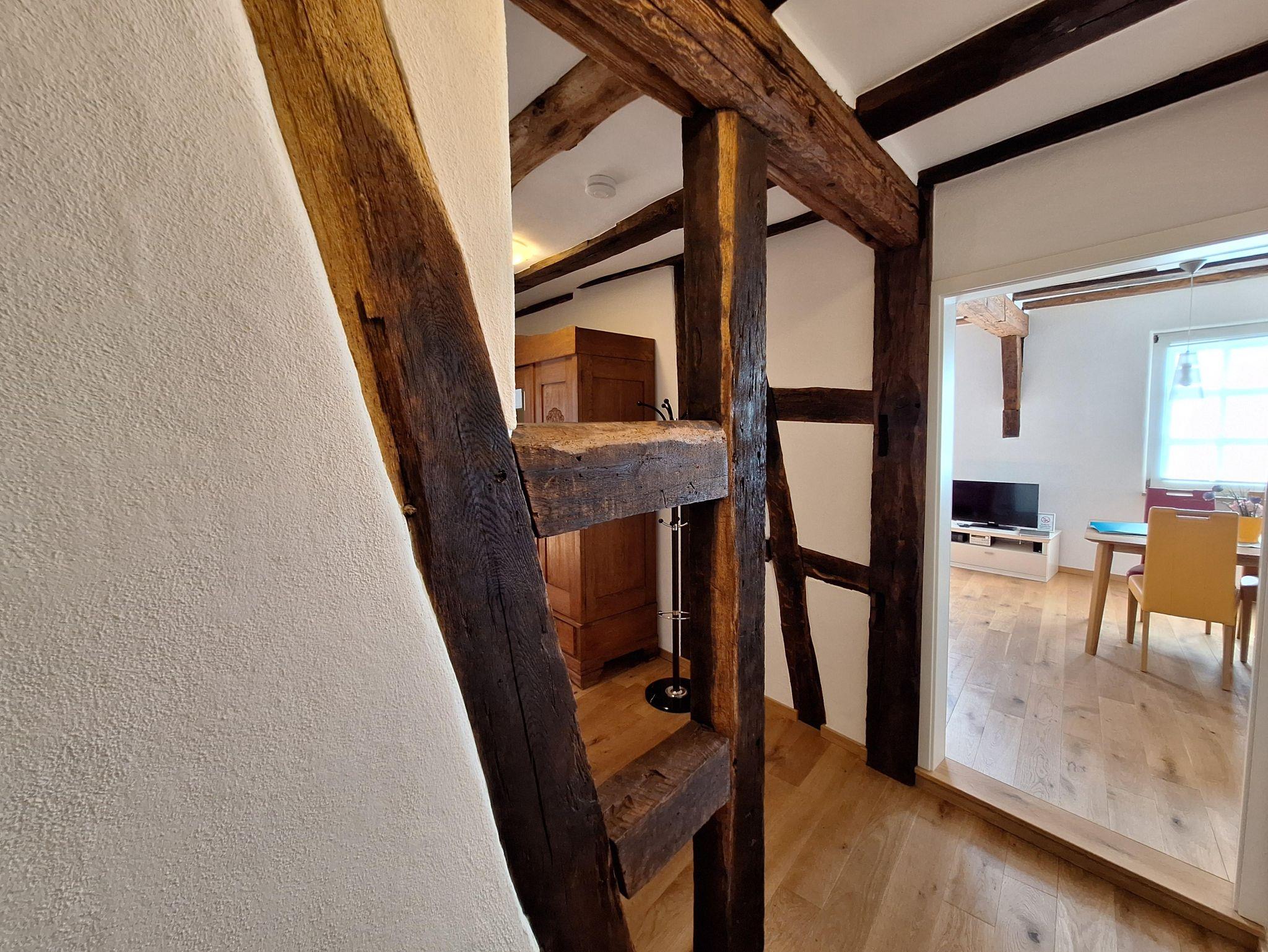 Die Ferienwohnung “Bergblick” befindet sich im Erdgeschoss des Hauses. Das Herzstück ist die kleine Wohn- und Essküche, gemütlich im Stil des historischen Hauses eingerichtet. In der Küche sind Ceranfeldherd, Backofen, Spülmaschine, Toaster, Wasserkocher und einem Kühlschrank mit Gefrierfach vorhanden. Im separaten Schlafzimmer befindet sich ein Doppelbett, für ruhige und erholsame Nächte. Bezogene Betten und Handtücher sind für uns eine Selbstverständlichkeit. Das Badezimmer ist mit einer ebenerdigen Dusche, einem WC sowie einem Handtuchwärmer und Fön ausgestattet.