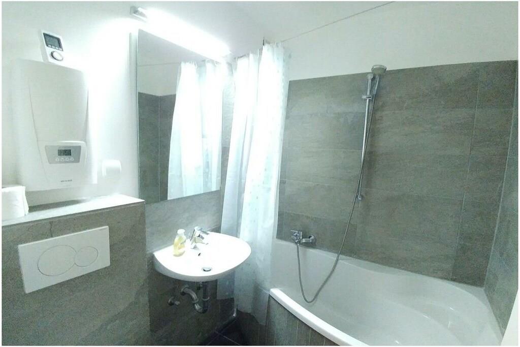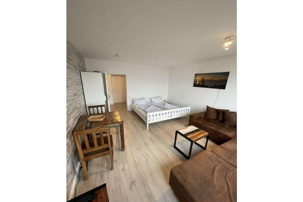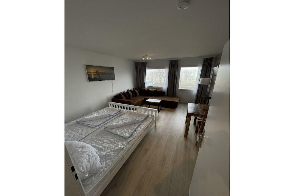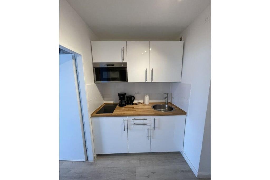 The 1-room holiday apartment offers enough space for two people and has been completely renovated. The holiday apartment is equipped with a double bed (180 cm x 200 cm) and a spacious sofa, which can also be used as a sofa bed for a third person if required. (Please inquire in good time). The living area is equipped with a smart TV. The kitchen is equipped with high-quality amenities for self-catering, including a refrigerator, two hotplates and various small appliances. The full bathroom has a corner bathtub.