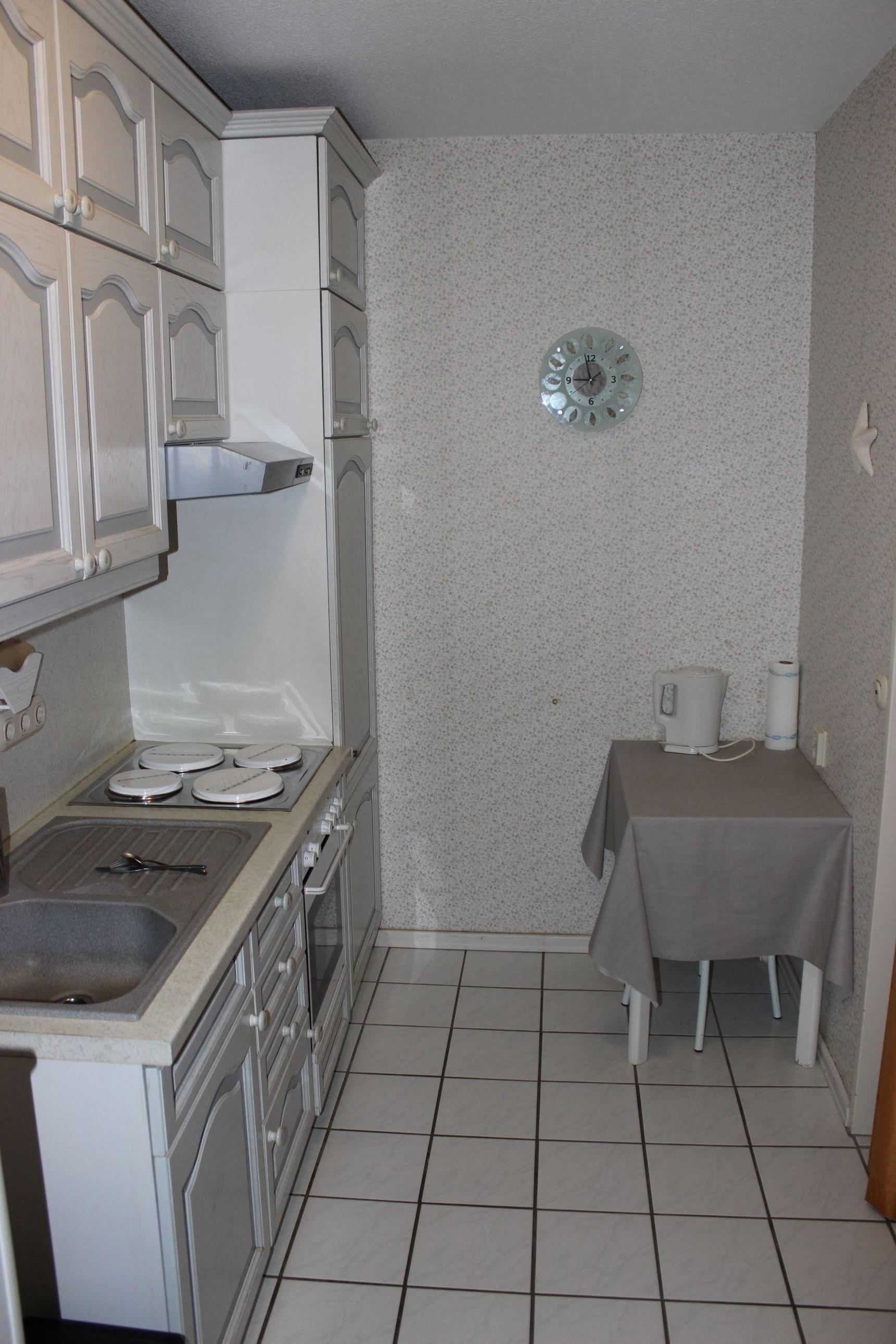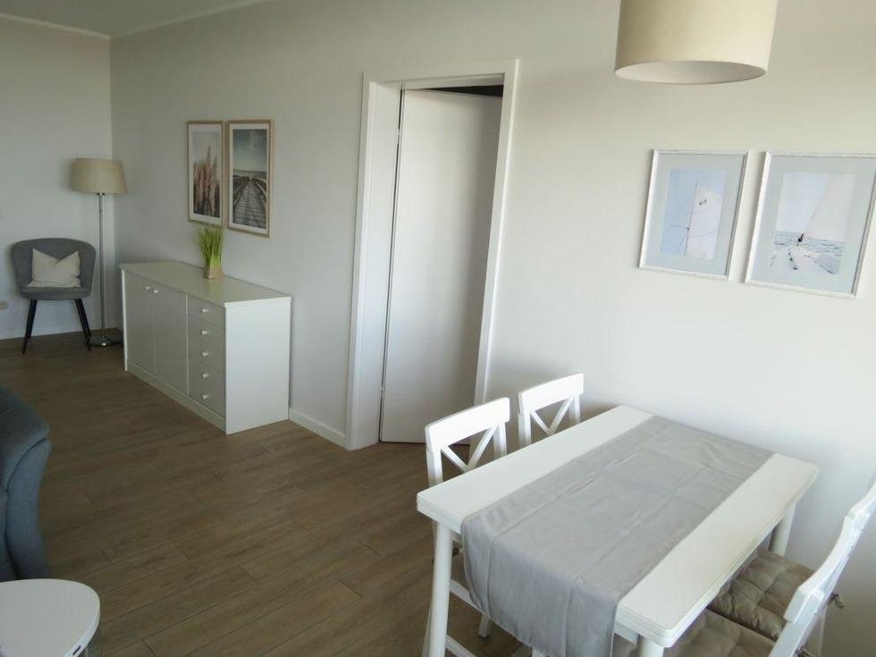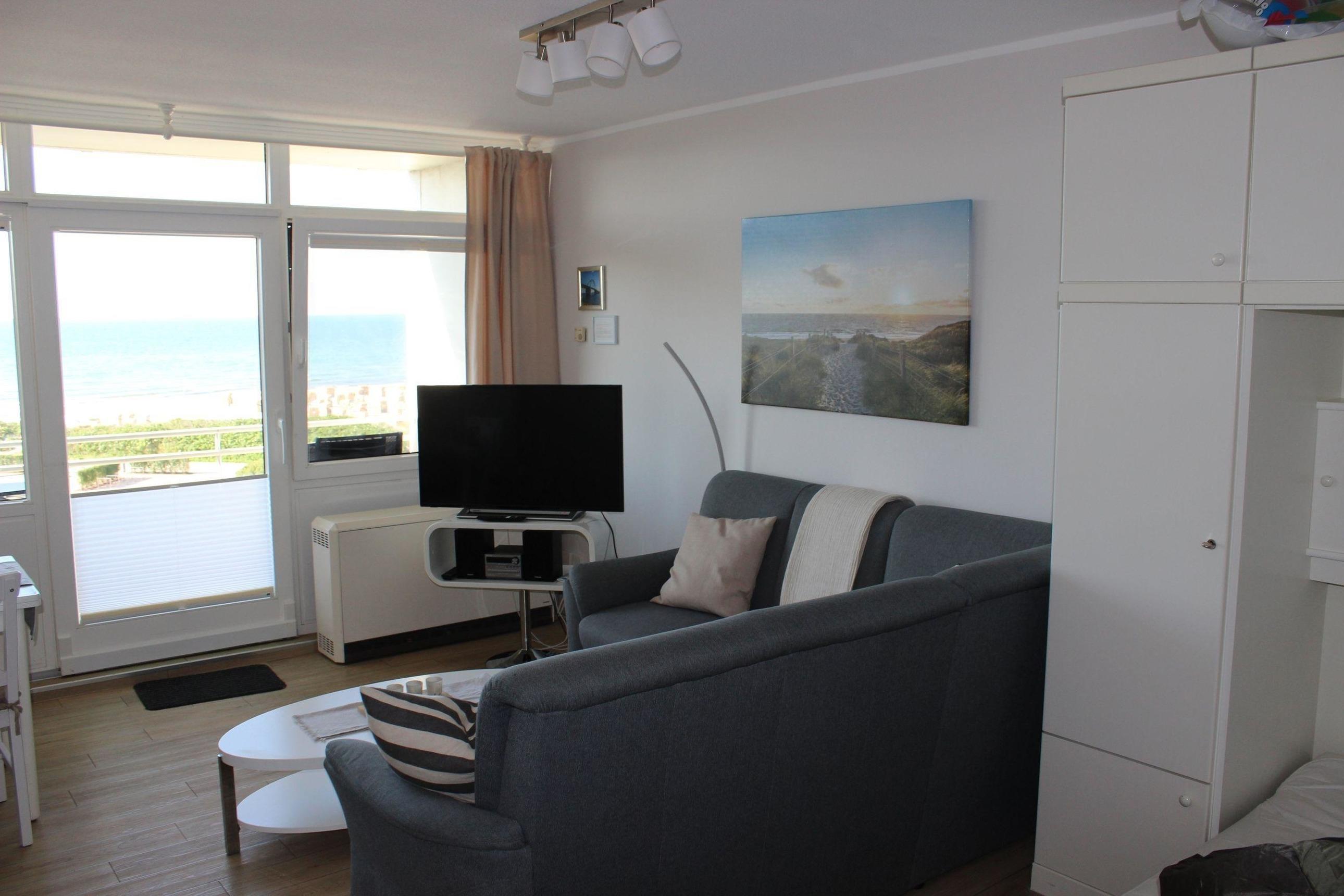 Die helle Ferienwohnung bietet Ihnen ein lichtdurchfluteten Wohnbereich mit komfortabler Einrichtung. Von hier aus haben Sie einen fantastischen Blick zum Südstrand. Auf der gemütlichen Eckgarnitur können Sie einen entspannten Fernsehabend verbringen. Hier ist zudem ein Doppelschrankbett vorhanden, welches sich tagsüber ganz einfach einklappen lässt. Am Esstisch mit 4 Stühlen, können Sie zusammen leckere Mahlzeiten genießen. Diese können Sie ganz einfach in der separaten Küche zubereiten. Die Küche bietet Ihnen unter anderem einen Elektroherd mit Backofen, einen Kühlschrank, sowie einen Toaster und eine Kaffeemaschine.