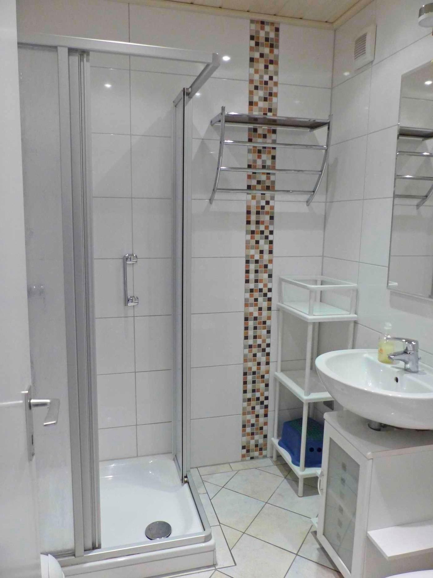 Im hellen und renovierten Badezimmer mit Dusche gibt es genügend Ablagemöglichkeiten.