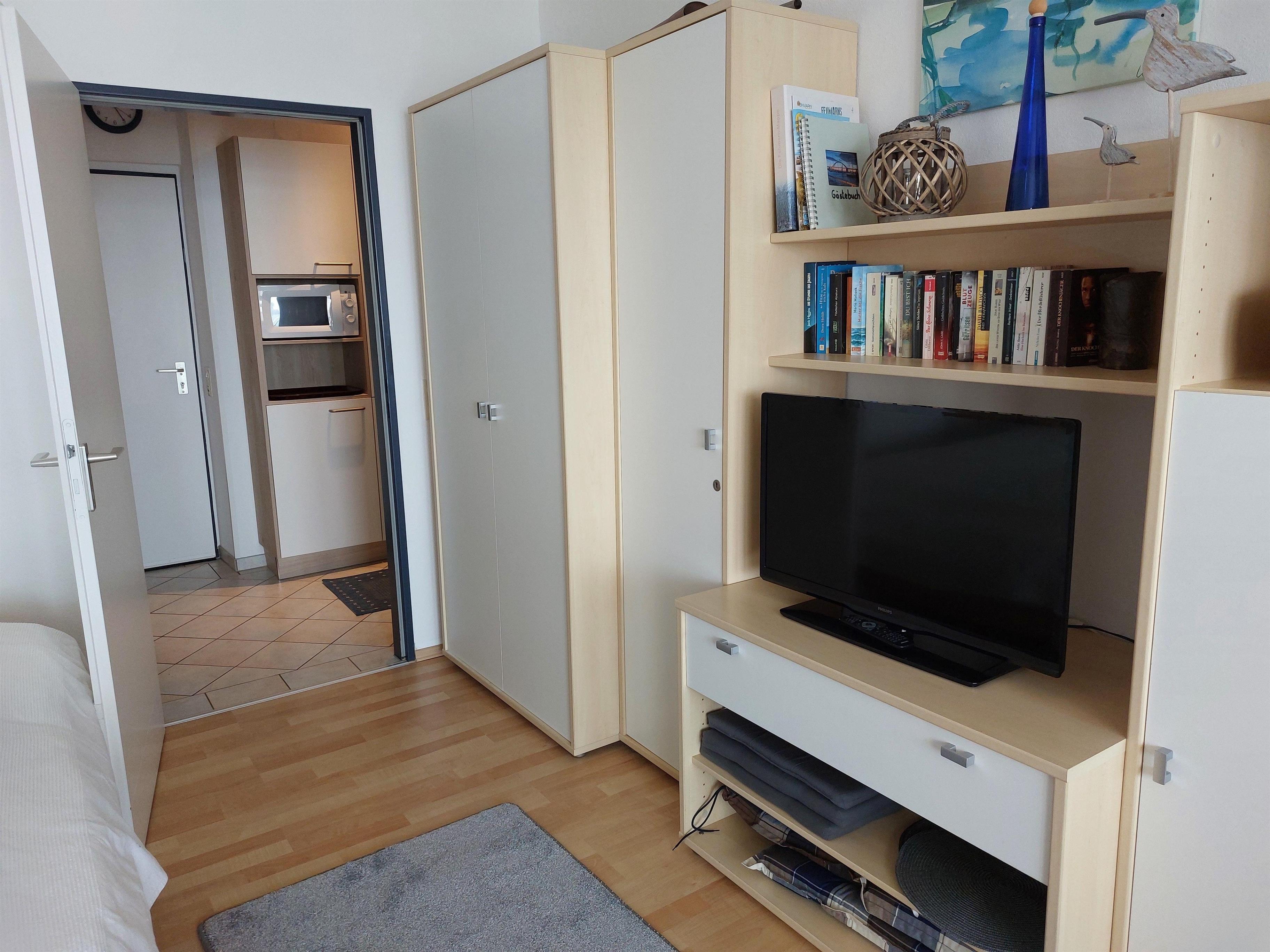 Im Wohnschlafraum befindet sich ein Doppelbett (160x200), eine gemütliche Sitzgarnitur für 4 Personen, TV, Radio, Schrank. Am runden Esstisch mit Blick auf die Ostsee finden bis zu 4 Personen Platz.