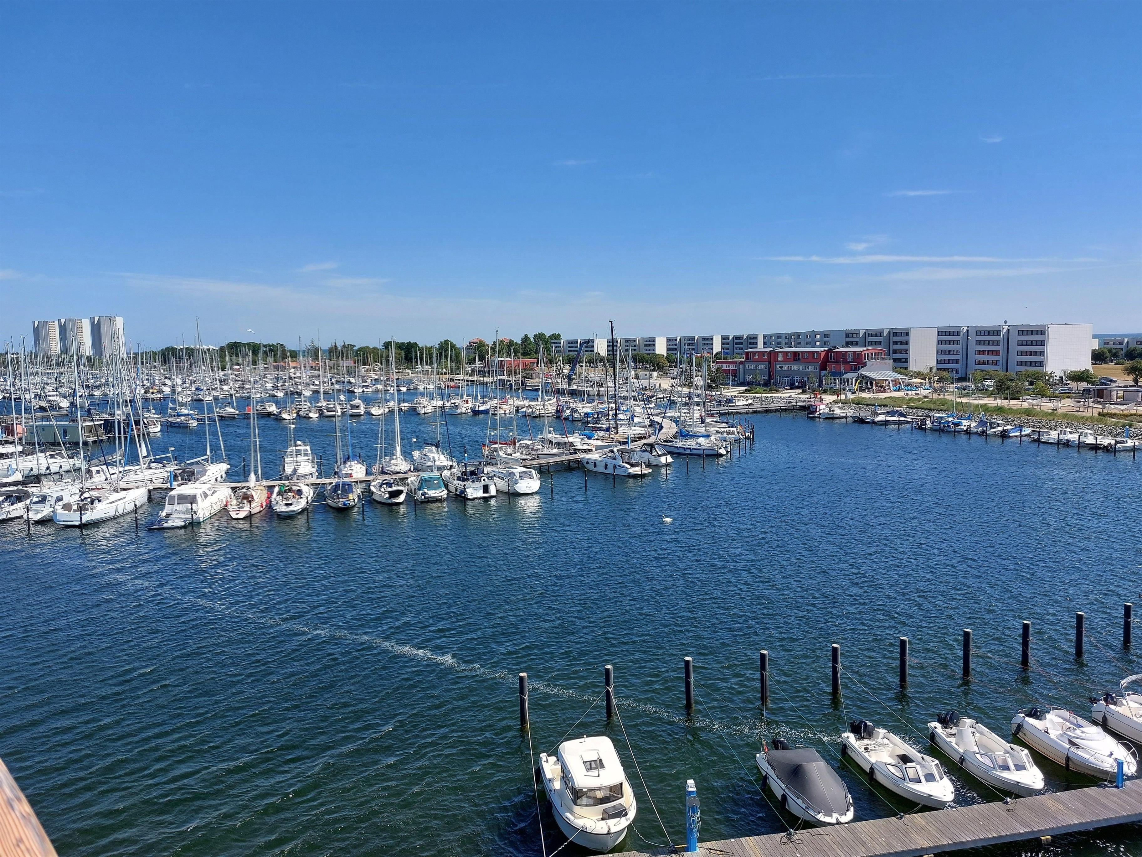 Sie bietet einen direkten Blick auf die Ostsee und die ein- und ausfahrenden Boote und liegt am Ende einer Landzunge zwischen Ostsee und Binnensee.