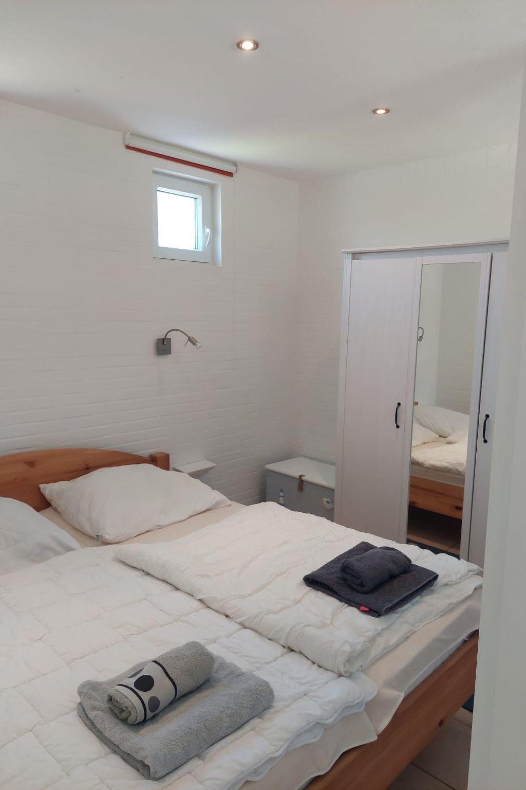 Shower/WC, double bed, mirror, wardrobe, reading lamps, large wardrobe, high chair, garden furniture, parasol, dining table with 4 chairs, sun lounger, chair cushions, barbecue, garden shed,