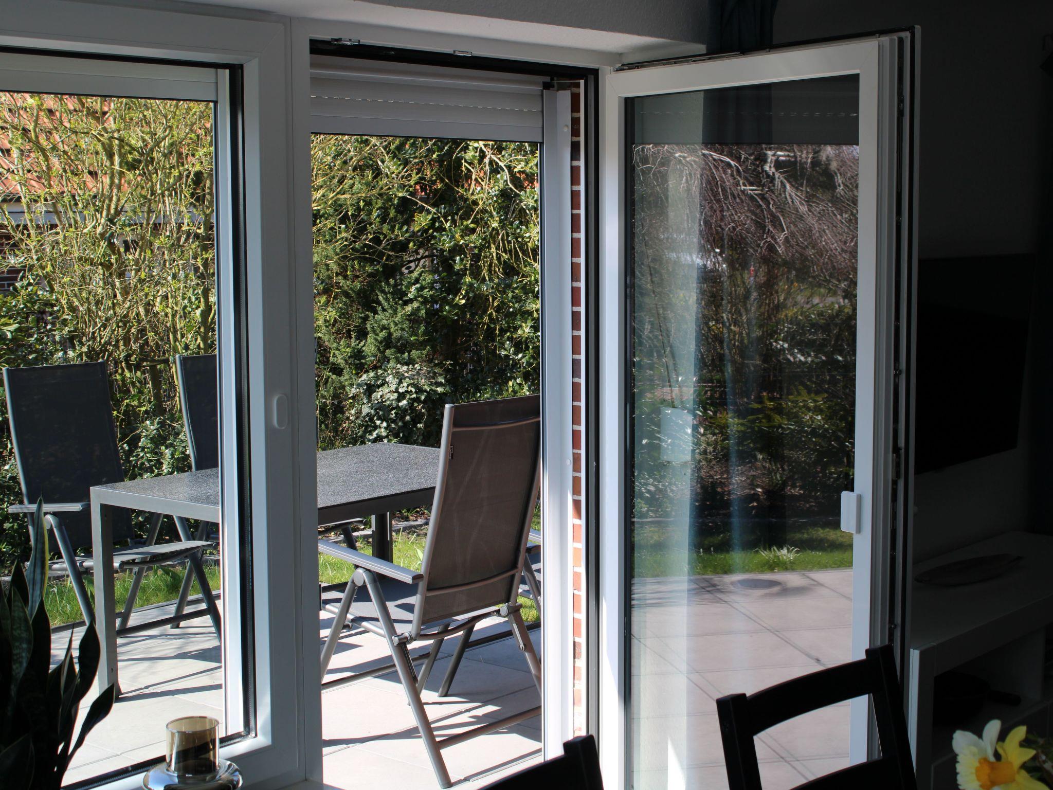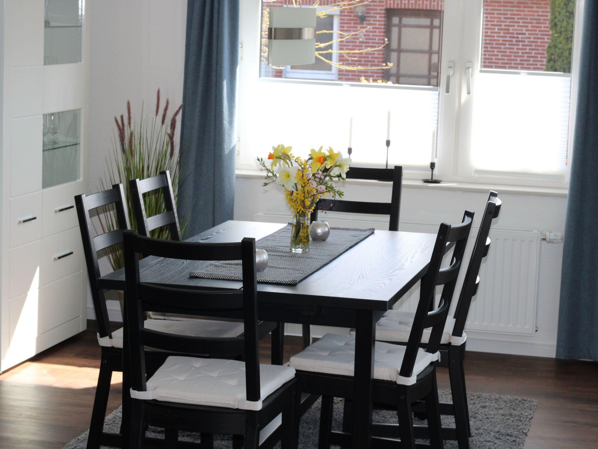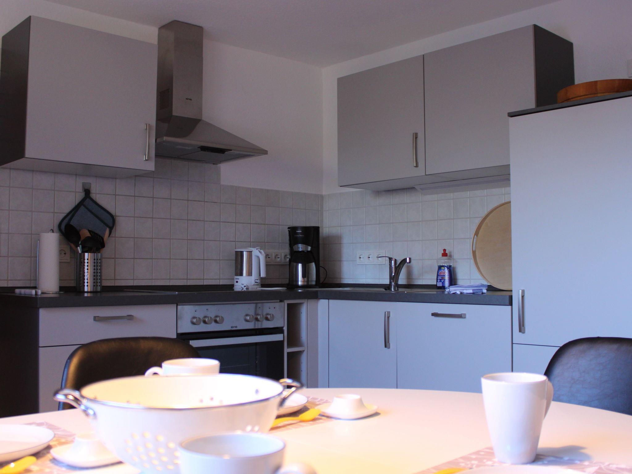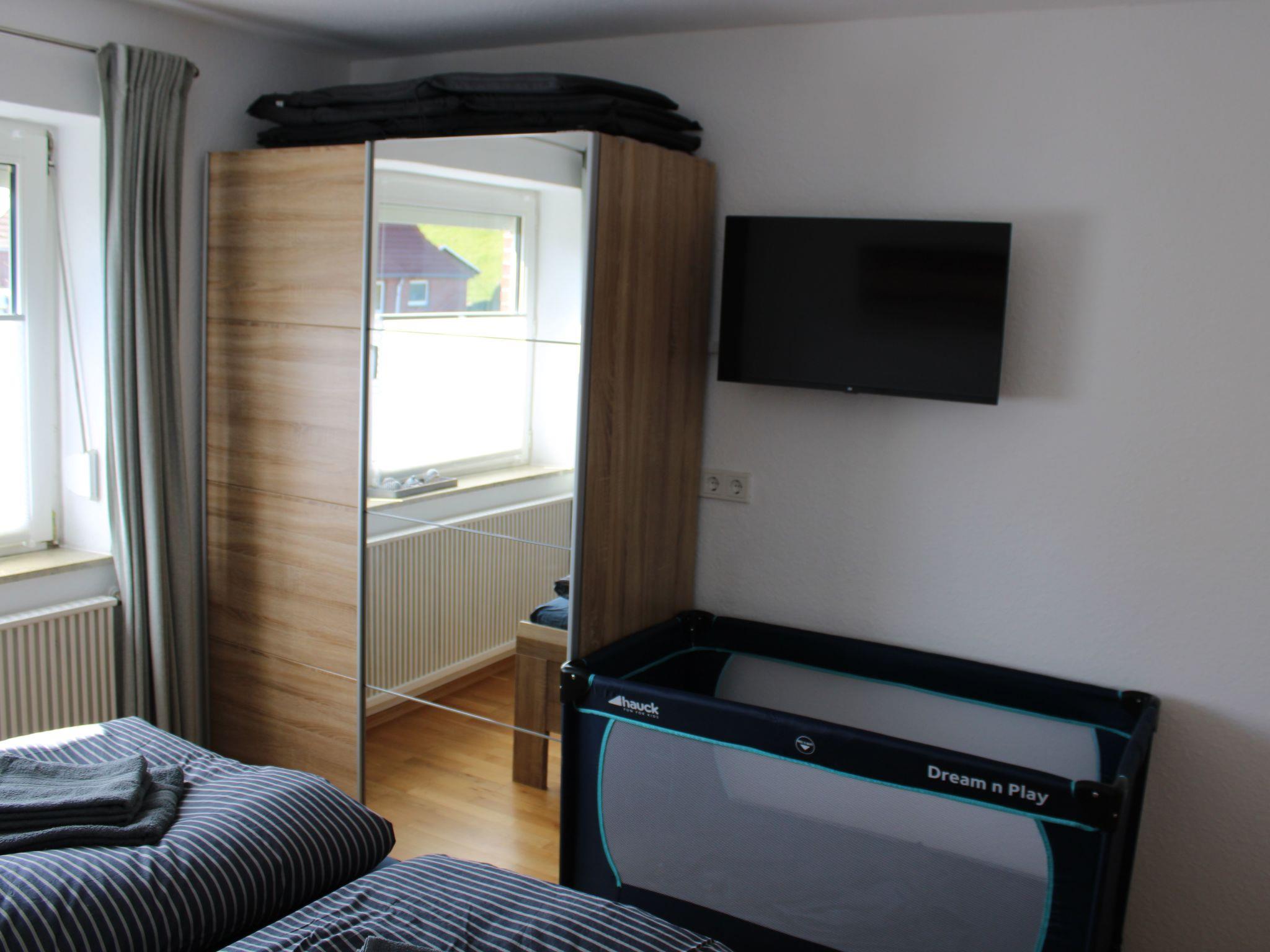 The 100sqm large holiday flat "Meerzeit" with two bedrooms (one bedroom with double bed, wardrobe, TV and one bedroom with two single beds, wardrobe, TV), living-dining room with a large, comfortable sofa, large TV, large dining table and terrace. A travel cot and high chair are available on request for younger guests. Fully equipped kitchen with ceramic hob, oven, dishwasher, microwave, kettle, filter and Senseo coffee machine and much more. Bathroom with walk-in shower and hairdryer. A second entrance leads directly into an anteroom with washing machine, ironing board and clothes horse. Up to four bicycles can be stored there.