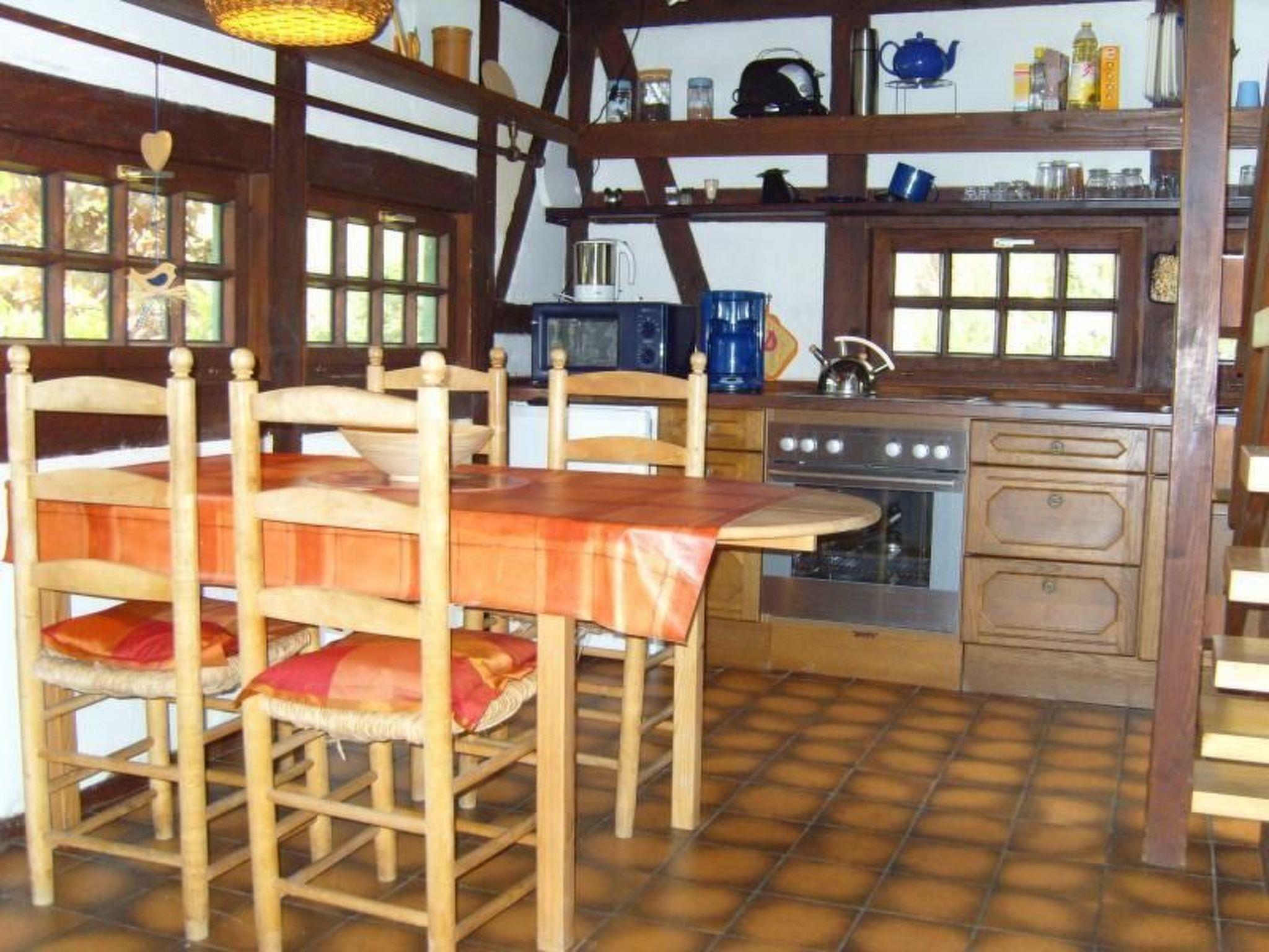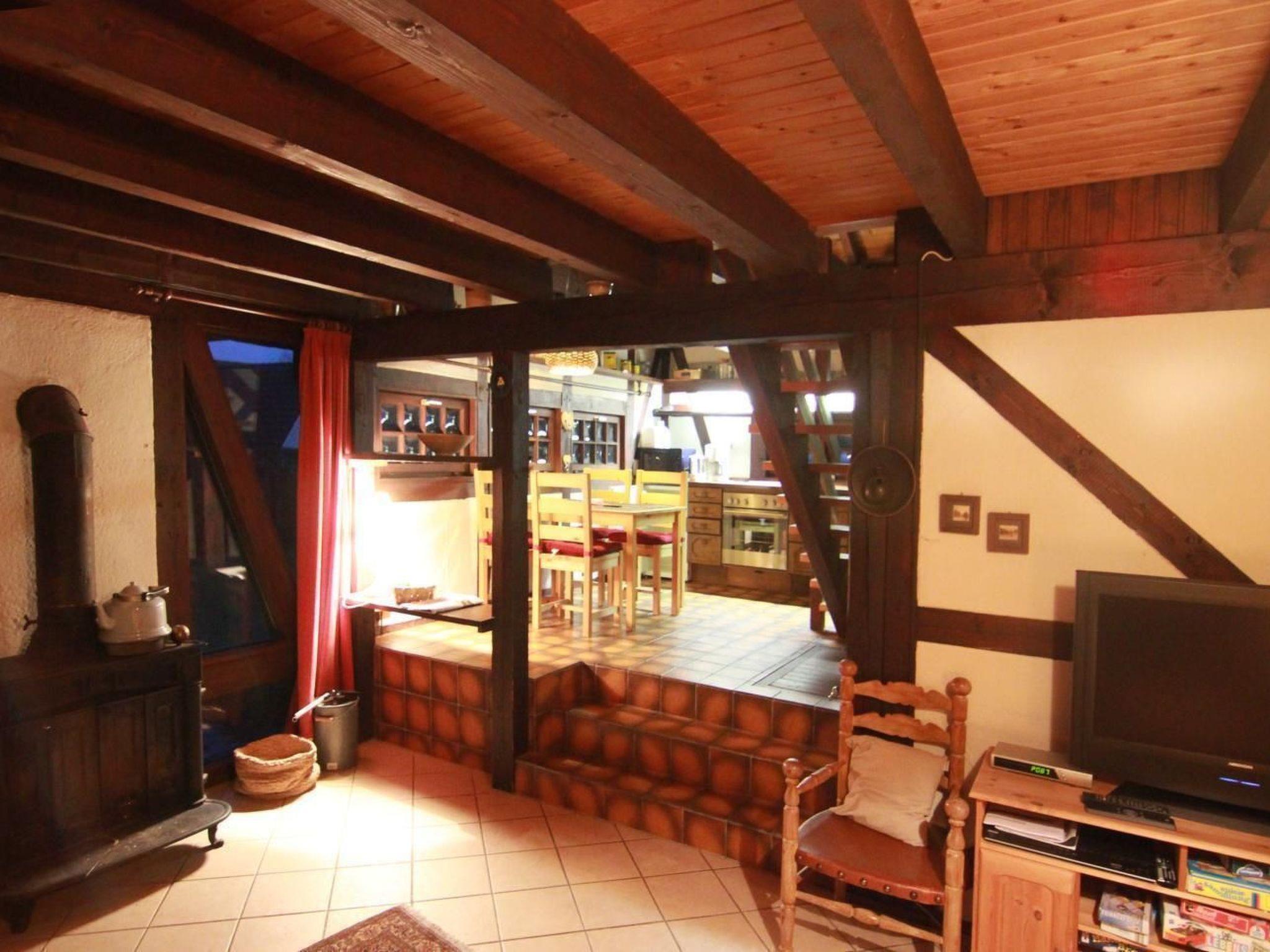 The cosy half-timbered holiday home is located in a quiet holiday home complex, adjacent to a quiet residential area in the North Sea resort of Burhave. The green beach, the play barn and the North Sea lagoon are approx. 10 minutes' walk away. On the ground floor: From the open-plan, fully equipped kitchen (including microwave, coffee machine, kettle and toaster) with dining area, 2 steps lead up to the tiled living room with flat-screen TV and DVD player, as well as an indoor fireplace. Shower room, separate WC. Upper floor: 2 bedrooms, each with a double bed (large alcoves)