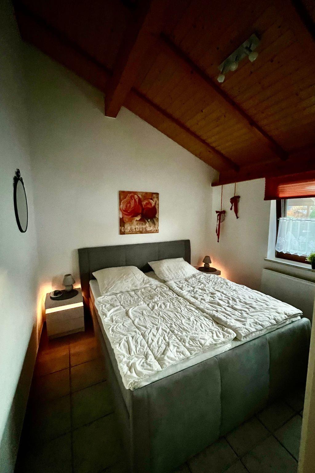 Inside, you will find a well thought-out living concept with a fully equipped fitted kitchen that invites you to cook together. A wood-burning stove and underfloor heating ensure cosiness on chilly days, while the open, light-flooded living room with its large panoramic windows invites you to relax. The bedroom boasts a comfortable, new box-spring bed (1.80 m x 2.00 m), which ensures a restful night's sleep. A separate storage room and a carport round off the offer.