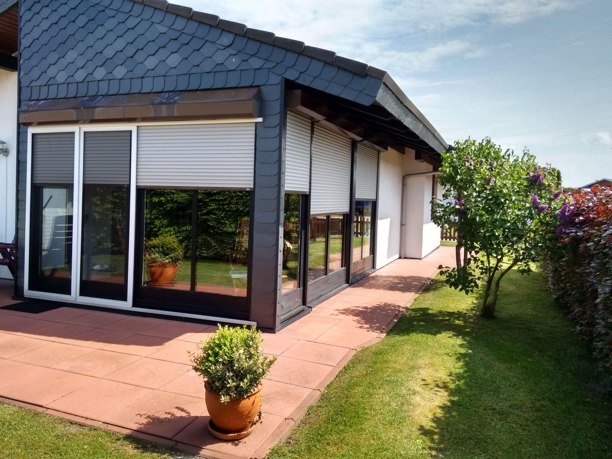 The outdoor area of the house invites you to relax. Enjoy the peace and quiet in the heated conservatory, which is furnished with a table and chairs, or relax in the garden, which invites you to linger with a table, garden chairs, cushions, two loungers and a beach chair. All windows are fitted with roller shutters, and the conservatory has additional blinds for pleasant sun protection.