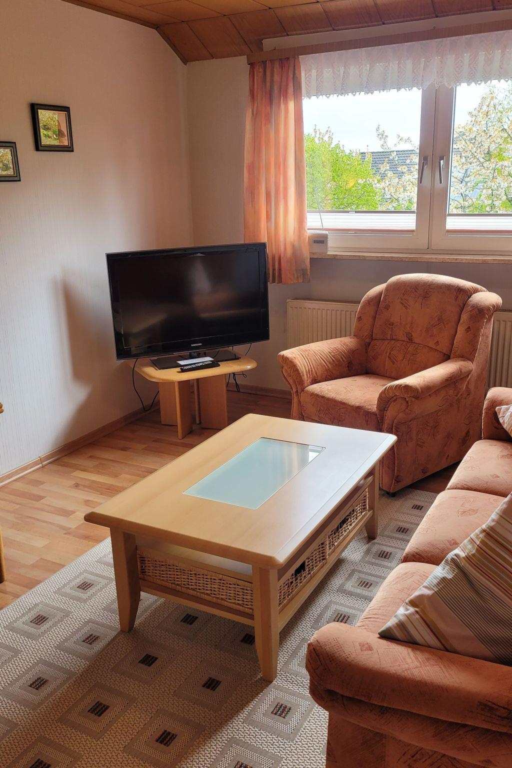 The 42 m² flat is designed for two people and offers you all the amenities you need for a pleasant stay. It is located on the upper floor of the house. The ground floor is occupied by the landlord. The holiday flat has a fully equipped kitchen with cooker, oven, coffee machine, kettle and dining area. In the living area there is a flat-screen TV, a cosy three-seater sofa and a TV armchair. The adjoining bedroom has a double bed two metres wide. The bathroom is equipped with a shower cubicle, WC and washbasin with mirror. The towels are changed weekly.