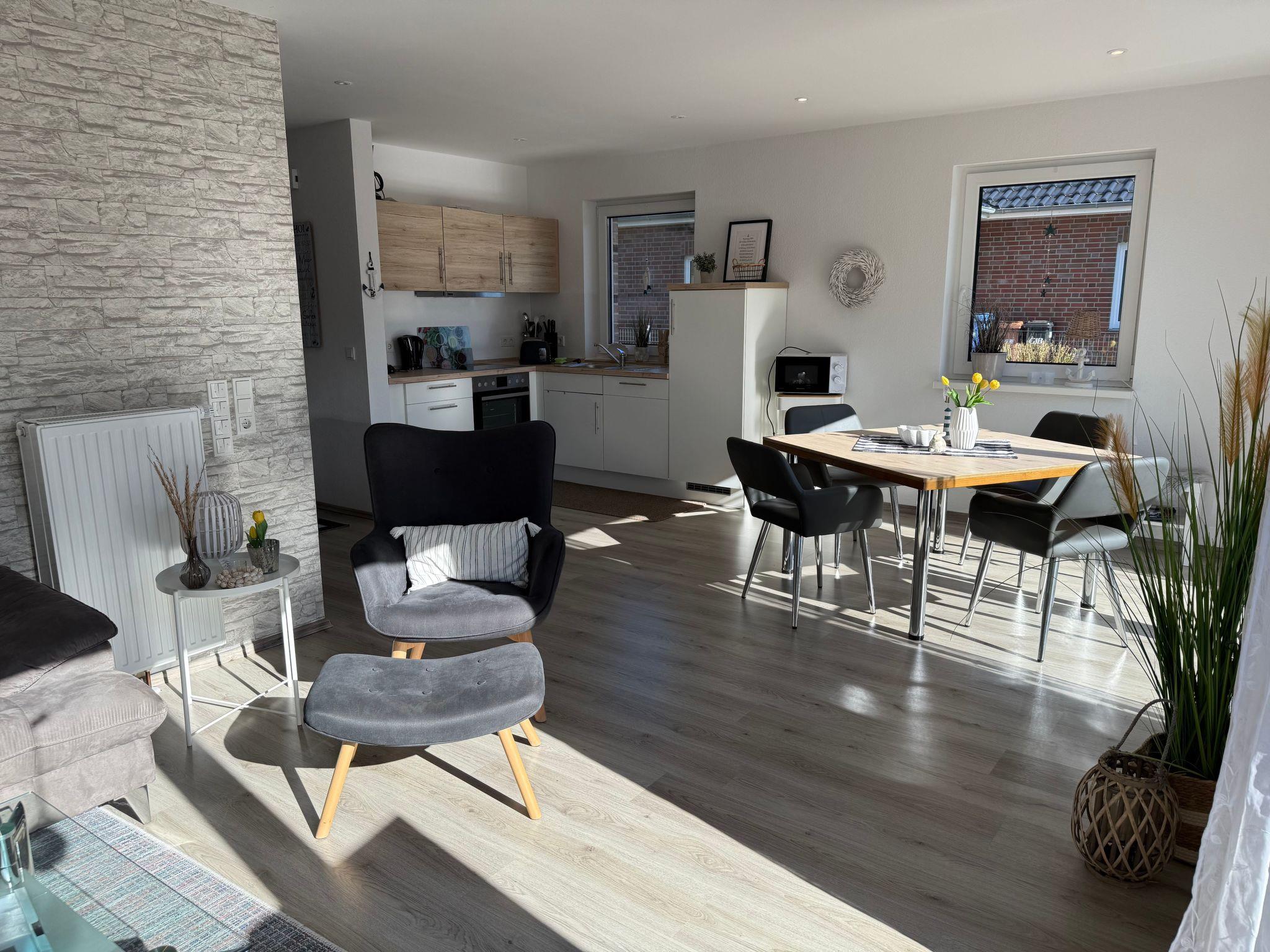 Your holiday home To Huus in Hoddersdiek No. 27 A is the right-hand side of the semi-detached house built in 2019. Furnished to a high standard in country house style, it is located in the middle of a mixed residential area between the centre and the beach, both of which are just a few minutes' walk away. There is also a bus stop at the pharmacy nearby.