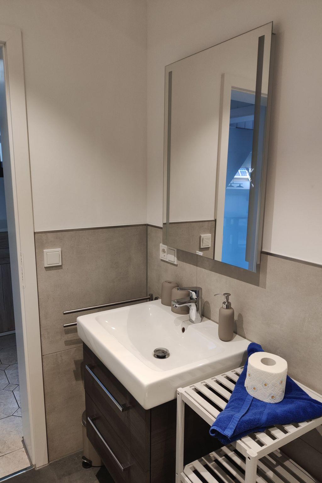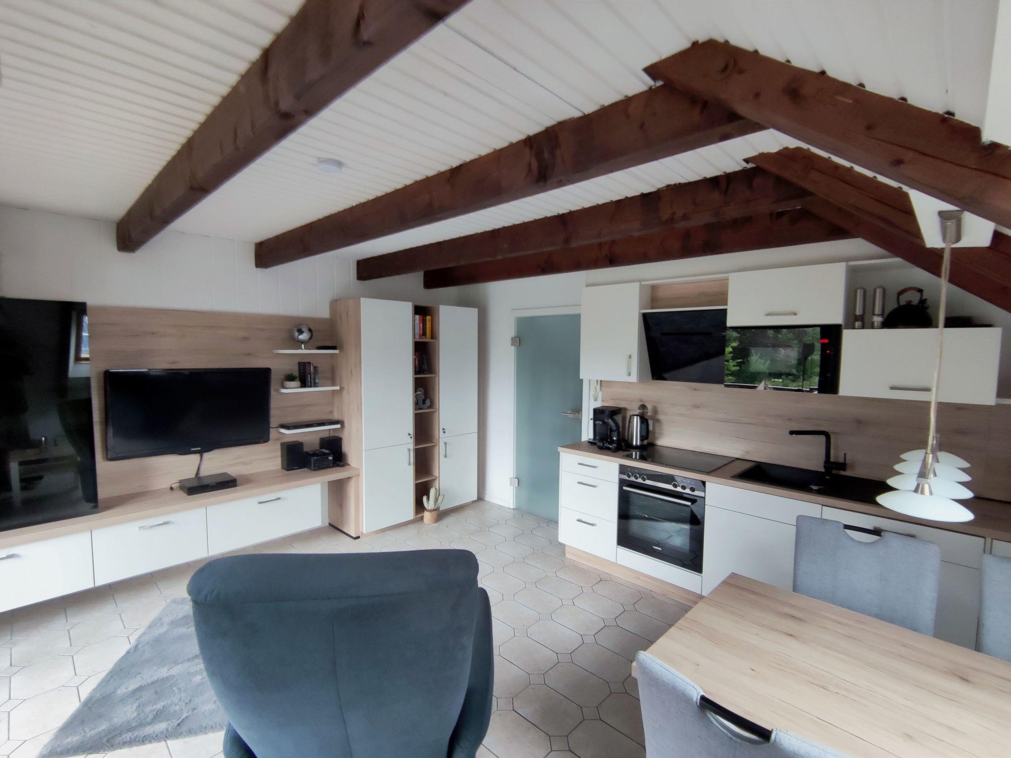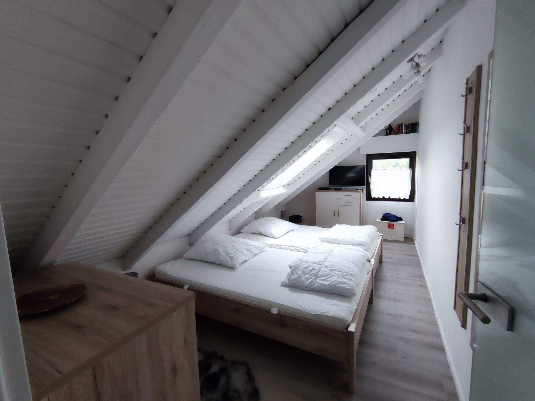 The holiday flat, freshly renovated in 2022, is located right in the heart of Butjadingen-Burhave. The brightly lit flat has been tastefully furnished with high-quality furniture. As soon as you enter the flat, you will see two translucent frosted glass doors that flood the entire flat with light. The ultra-modern bathroom with washbasin, WC, relaxing shower and heated towel rail is also located on the ground floor. Behind this is the cosy living area with a spacious and well-equipped kitchenette. The living area invites you to linger on beautiful summer days. From there you can also access the balcony, from which you can enjoy a fantastic view over the garden, the fields on the edge of Burhave and the church tower, which is picturesquely illuminated in the evening. Of course, comfortable balcony furniture is also available. Upstairs is the separate sleeping area, furnished with two large beds. There is also a second television.