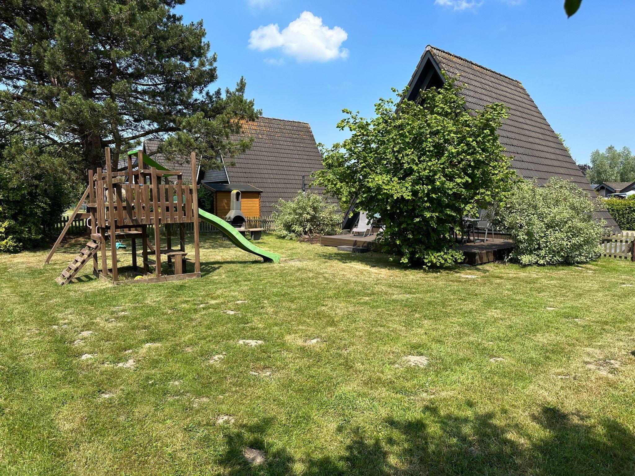 You can reach the terrace and the garden via the living area. The approx. 500 m² property is completely fenced in the rear area. Here you will find a large play area, a climbing tower with slide, a double swing, a seating area, a barbecue fireplace and the large, new terrace with two loungers, a garden table and garden chairs. Nothing stands in the way of a barbecue evening together. You can park a car in the private car park.