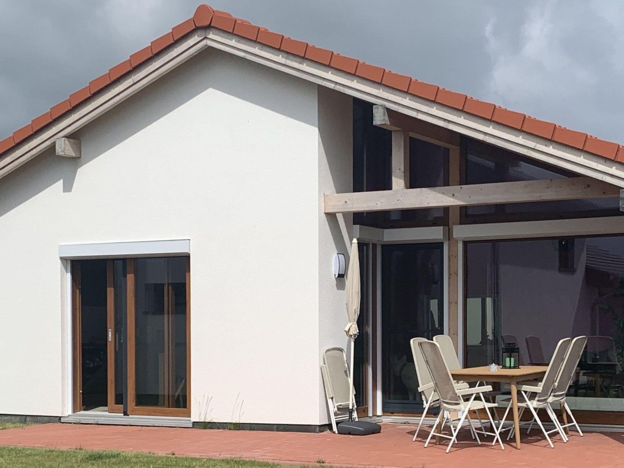 Newly built house G 9 in a peripheral location with a view of the landscape conservation area, completely fenced, 90 sqm living space, first occupancy 2021, own 472 sqm plot, pets allowed (max. 2), 2 bathrooms (1x walk-in shower 1.20m x 1.30m and 1x with flat shower tray 90×90 cm), electric shutters and fly screens on all windows, WLAN (fibre optic 300) free of charge, bedrooms with laminate flooring-rest of rooms tiled, TV in the living room, massive storage room approx. 10 sqm under the carport, washing machine. For 6 persons with 3 bedrooms and 2 full baths own 472 square metre property