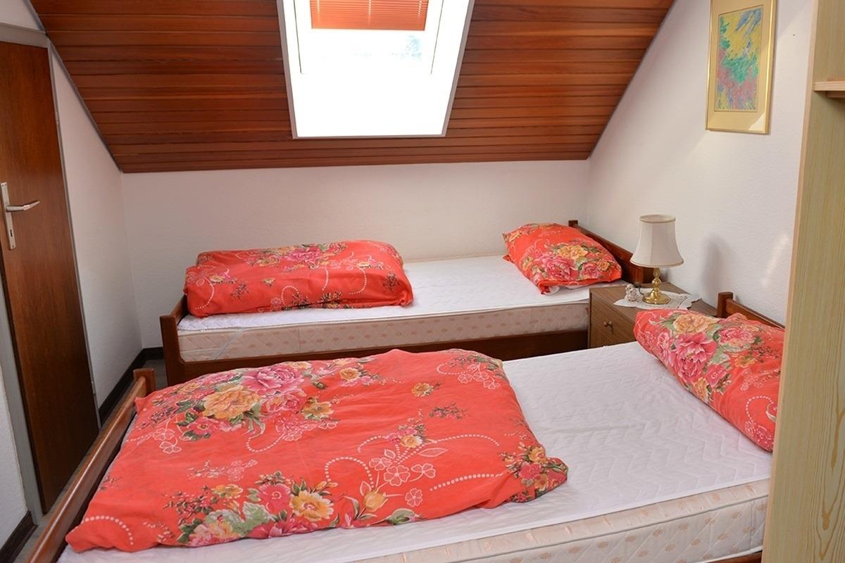 Die 54 qm Wohnung finden Sie in der oberen Etage mit einem Wohn / Esszimmer mit Couch und Hocker, sowie 2 Schlafzimmer, eines mit Doppelbett (180 x 200), und einem Schlafzimmer mit einem Einzelbett, zusätzlich ist bei diesem Bett ein zweiter Liegeplatz enthalten. Der Liegeplatz ist in Form einer Schublade gestaltet und ideal für Kinder. Die Küche ist mit einem E-Herd und Backofen, Mikrowelle, Geschirr etc. ausgestattet. Das Badezimmer hat eine Badewanne und WC. Auch hier haben Sie einen möblierten Balkon. Ideal ist die Wohnung für 3 Erwachsene oder 2 Erwachsene mit 2 Kindern. Über W-Lan können Sie ins Internet. Fahrräder können am Hallenbad im Fahrradständer abgestellt werden. Kinderbett und Hochstuhl sind auf Anfrage möglich. 1 Hund ist erlaubt, gegen Gebühr.
