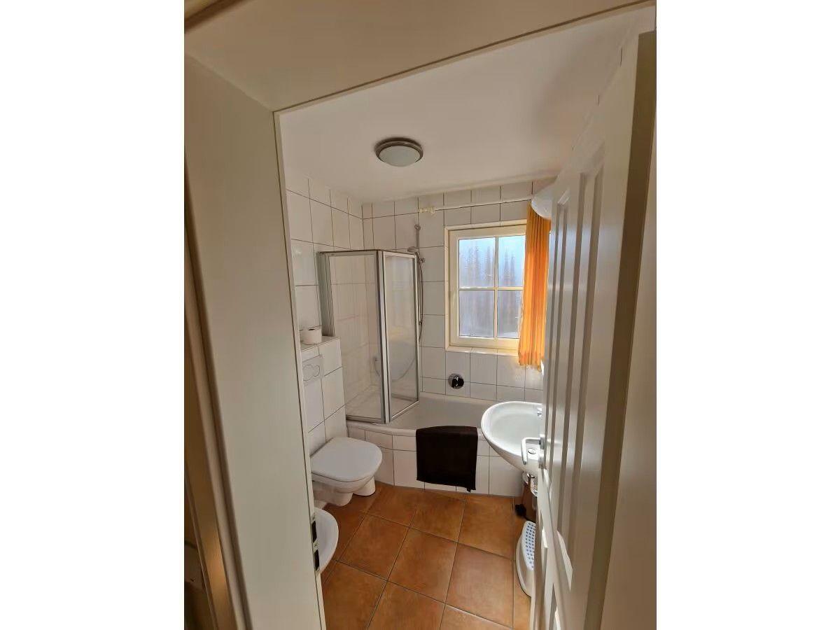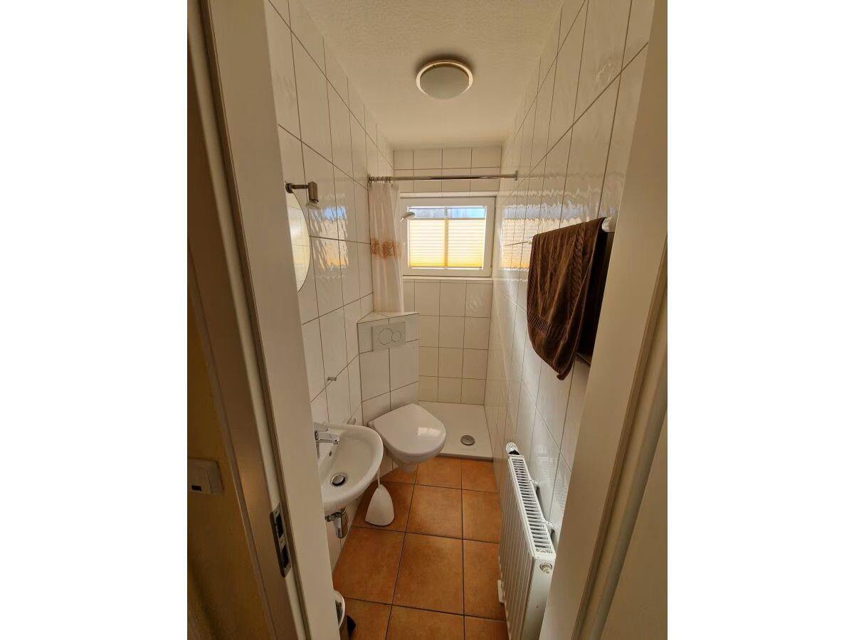Die beiden Badezimmer, jeweils mit einer Dusche, Waschbecken, Spiegel und Fenster ausgestattet, sorgen für ausreichend Komfort auch bei mehreren Gästen.