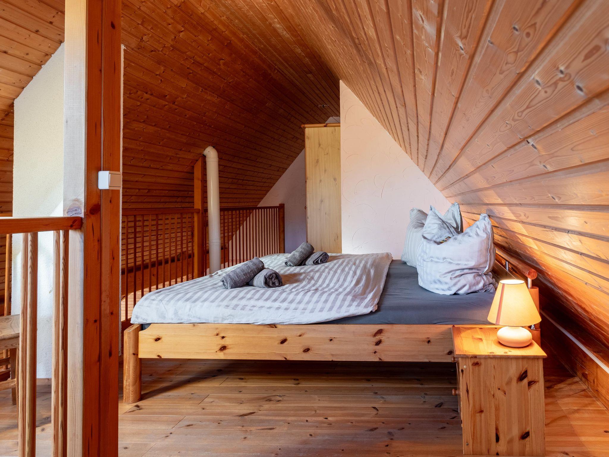 Vom Wohnzimmer aus erreichen Sie alle weiteren Räume sowie die großzügige Dachterrasse mit seitlichem Wasserblick. Über eine Treppe gelangen Sie zudem auf die offene Schlafgalerie, die mit einem Doppelbett und Kleiderschrank eingerichtet ist.