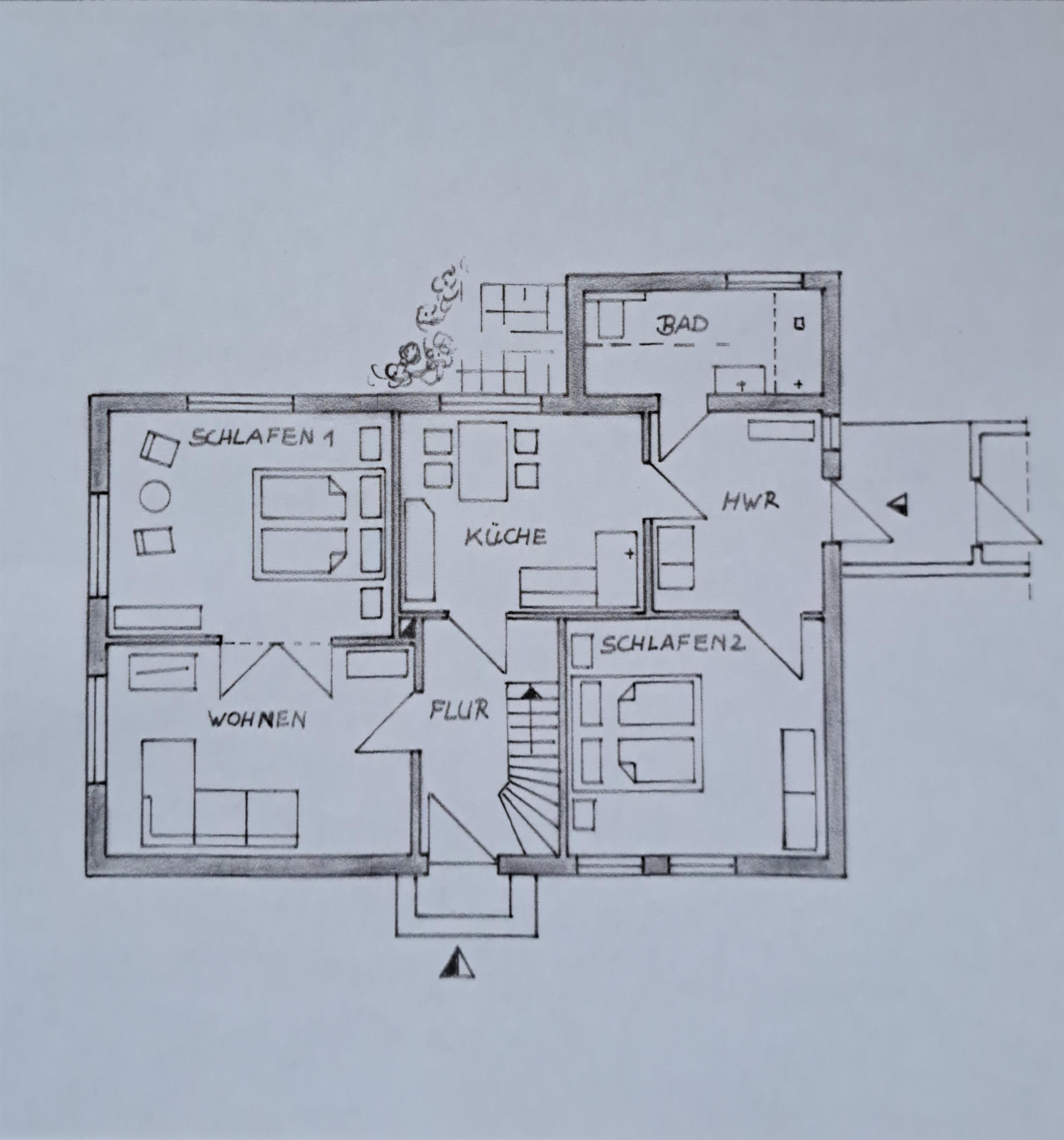 Sie betreten die im Erdgeschoss gelegene Wohnung über 2 kleine Stufen im Eingangsbereich.