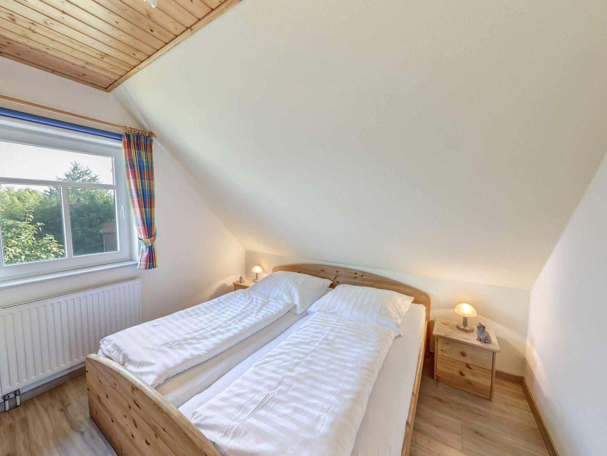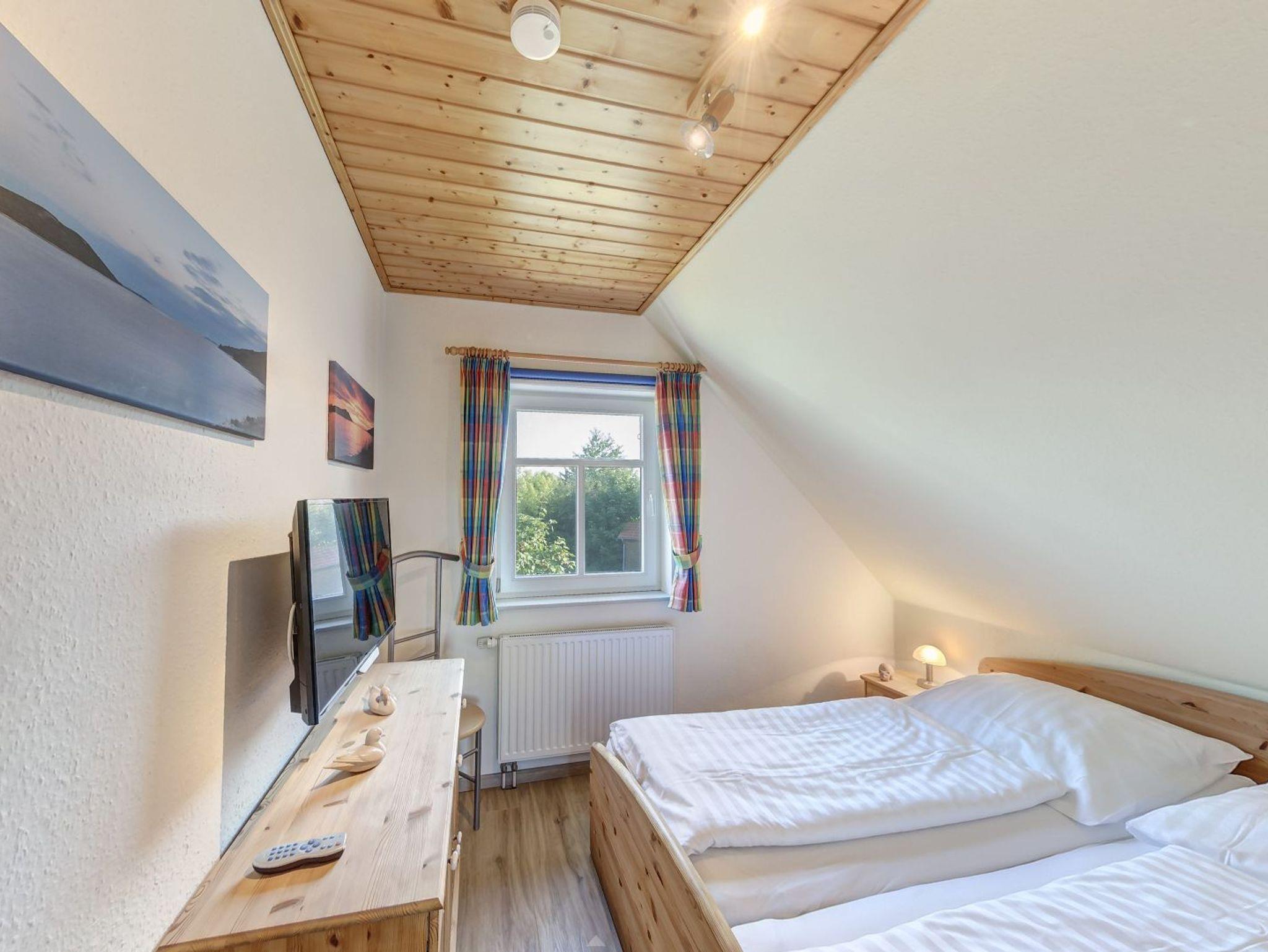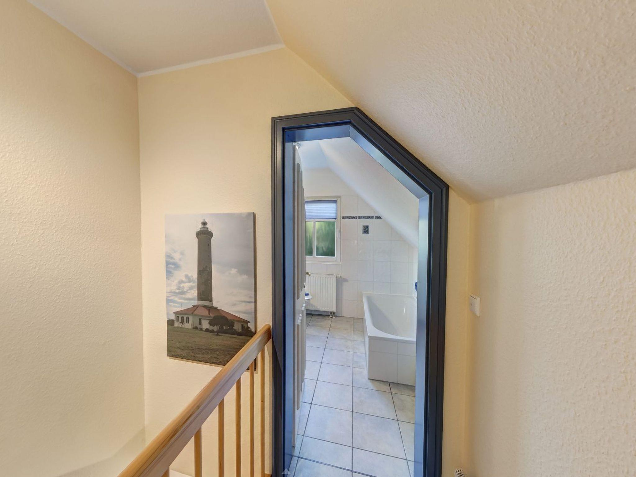 Das Obergeschoss der Doppelhaushälfte erreichen Sie über eine Holztreppe. Hier befindet sich ein Schlafzimmer mit Doppelbett und ein weiteres Schlafzimmer mit einem oder zwei Einzelbetten. Ein zweites Badezimmer mit Dusche und WC finden sie ebenfalls hier.
