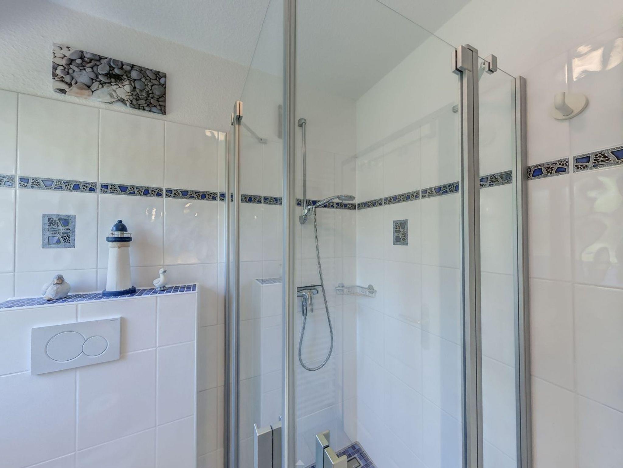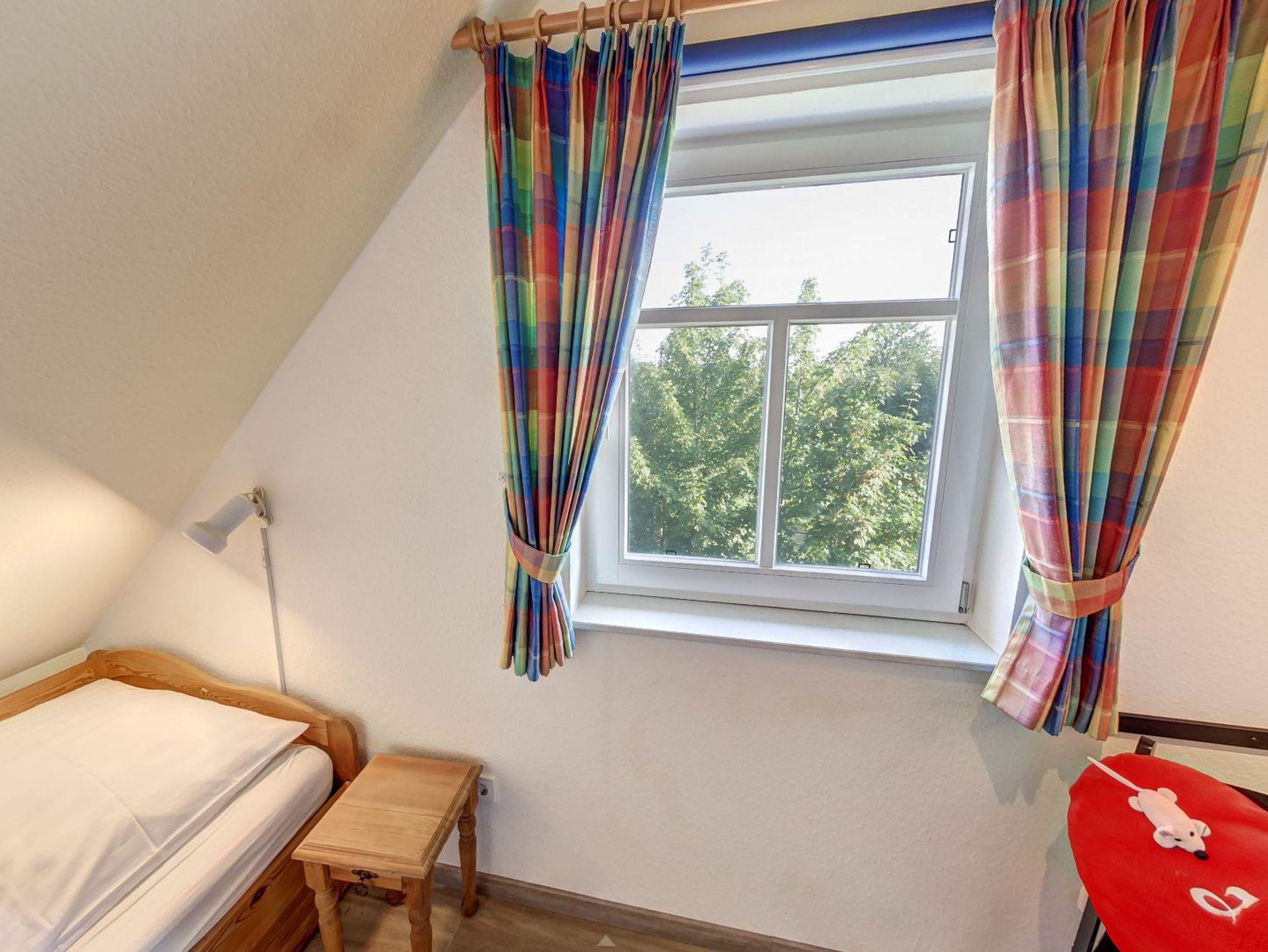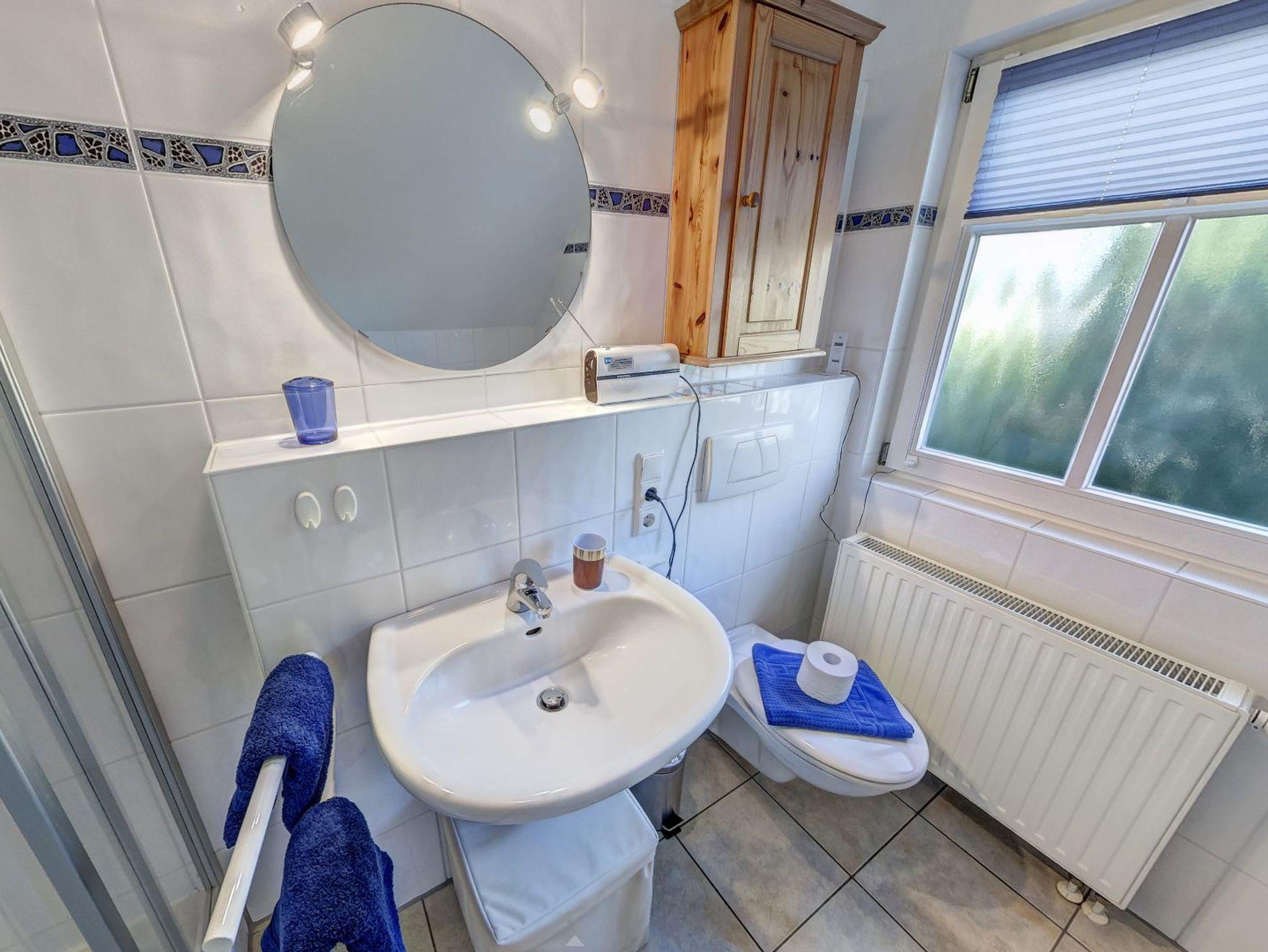 Das Obergeschoss der Doppelhaushälfte erreichen Sie über eine Holztreppe. Hier befindet sich ein Schlafzimmer mit Doppelbett und ein weiteres Schlafzimmer mit einem oder zwei Einzelbetten. Ein zweites Badezimmer mit Dusche und WC finden sie ebenfalls hier.