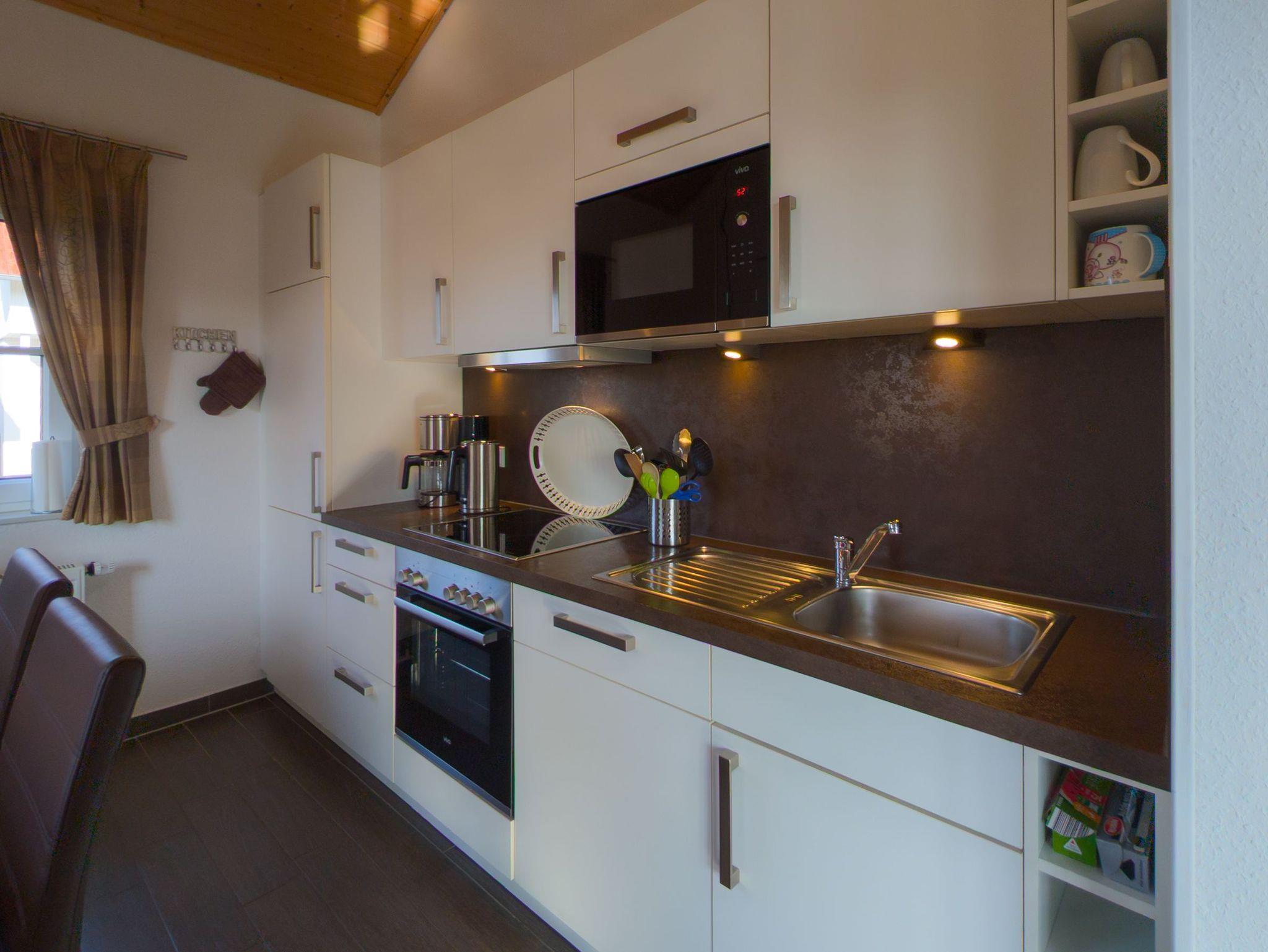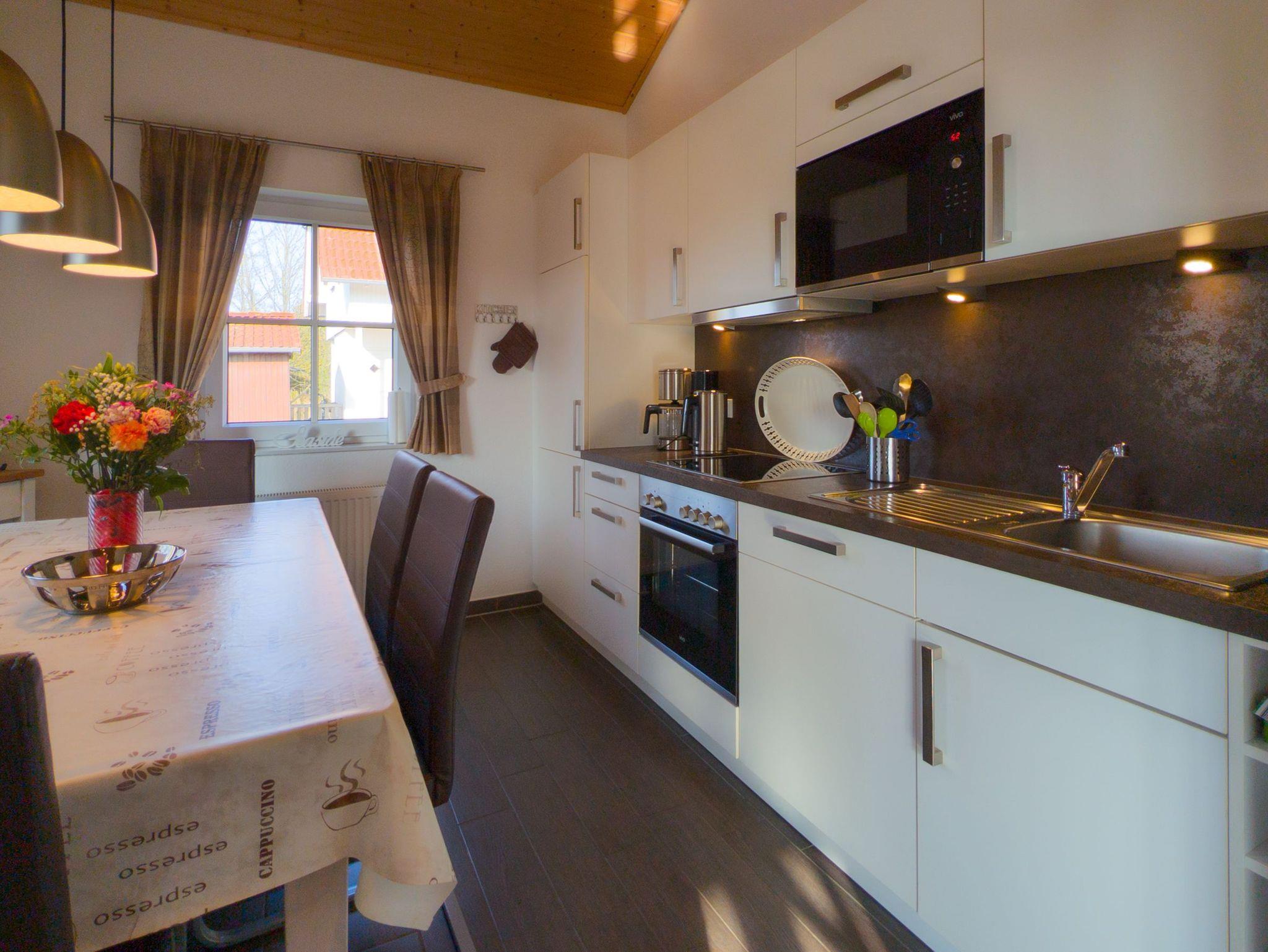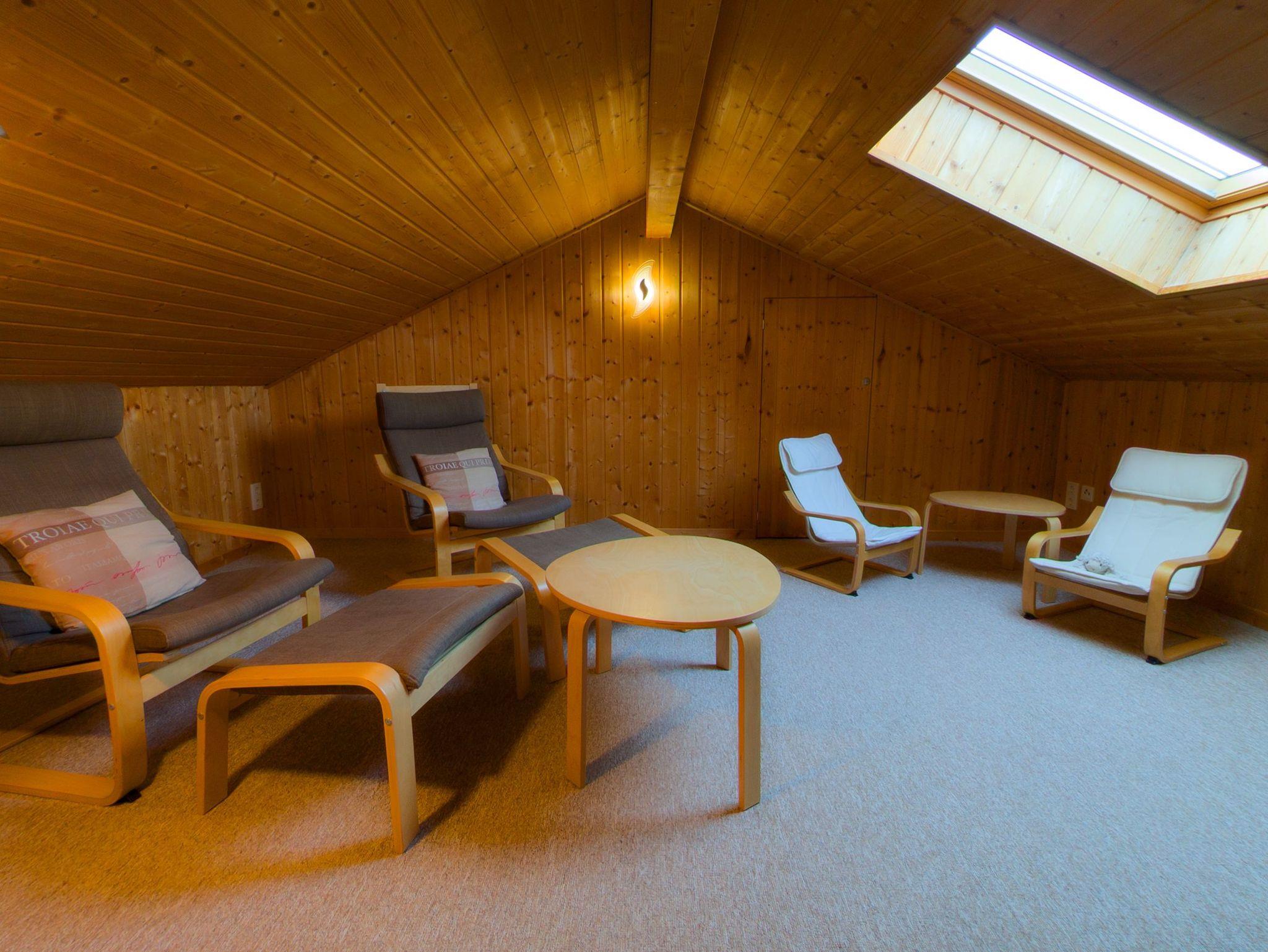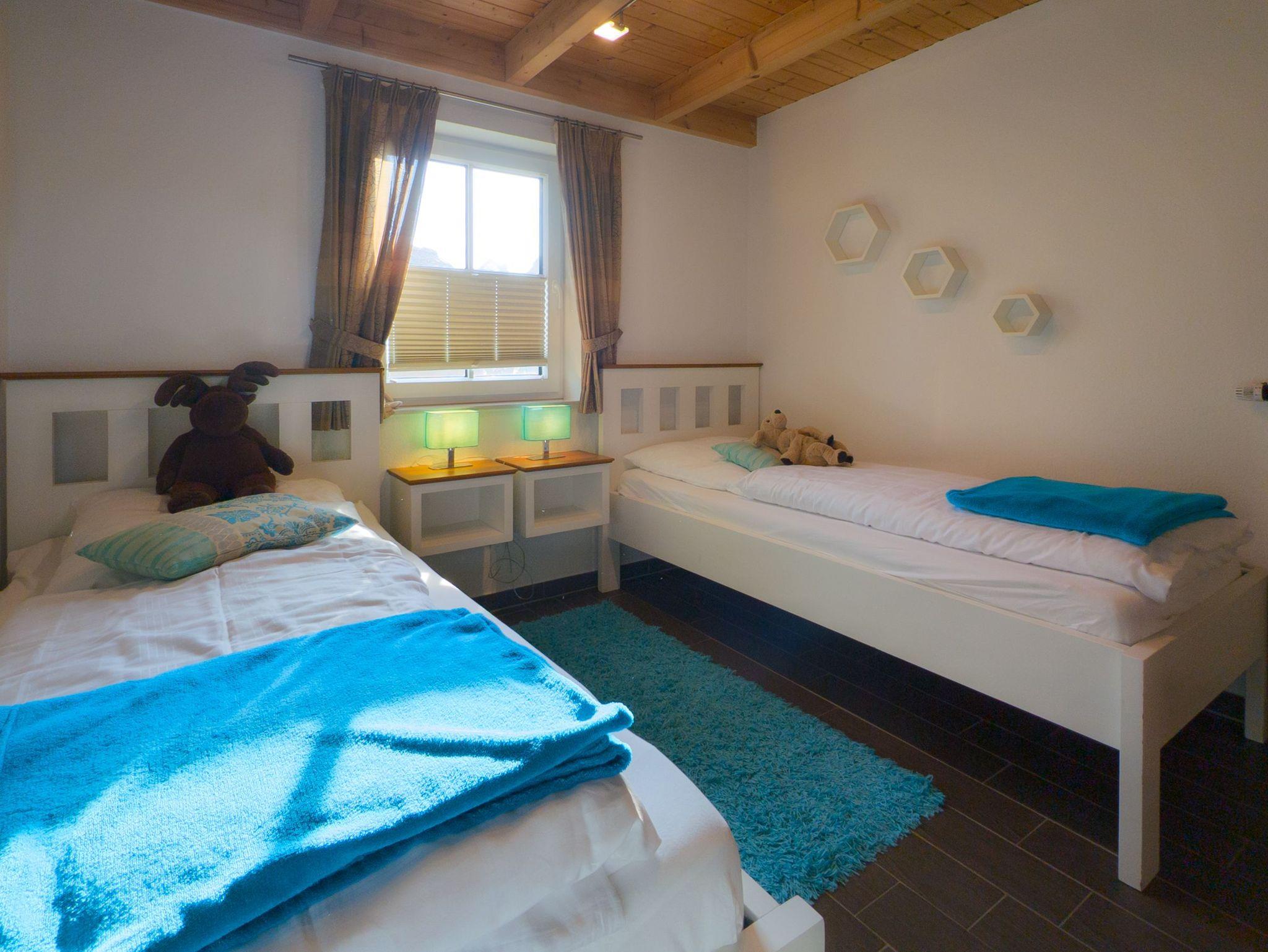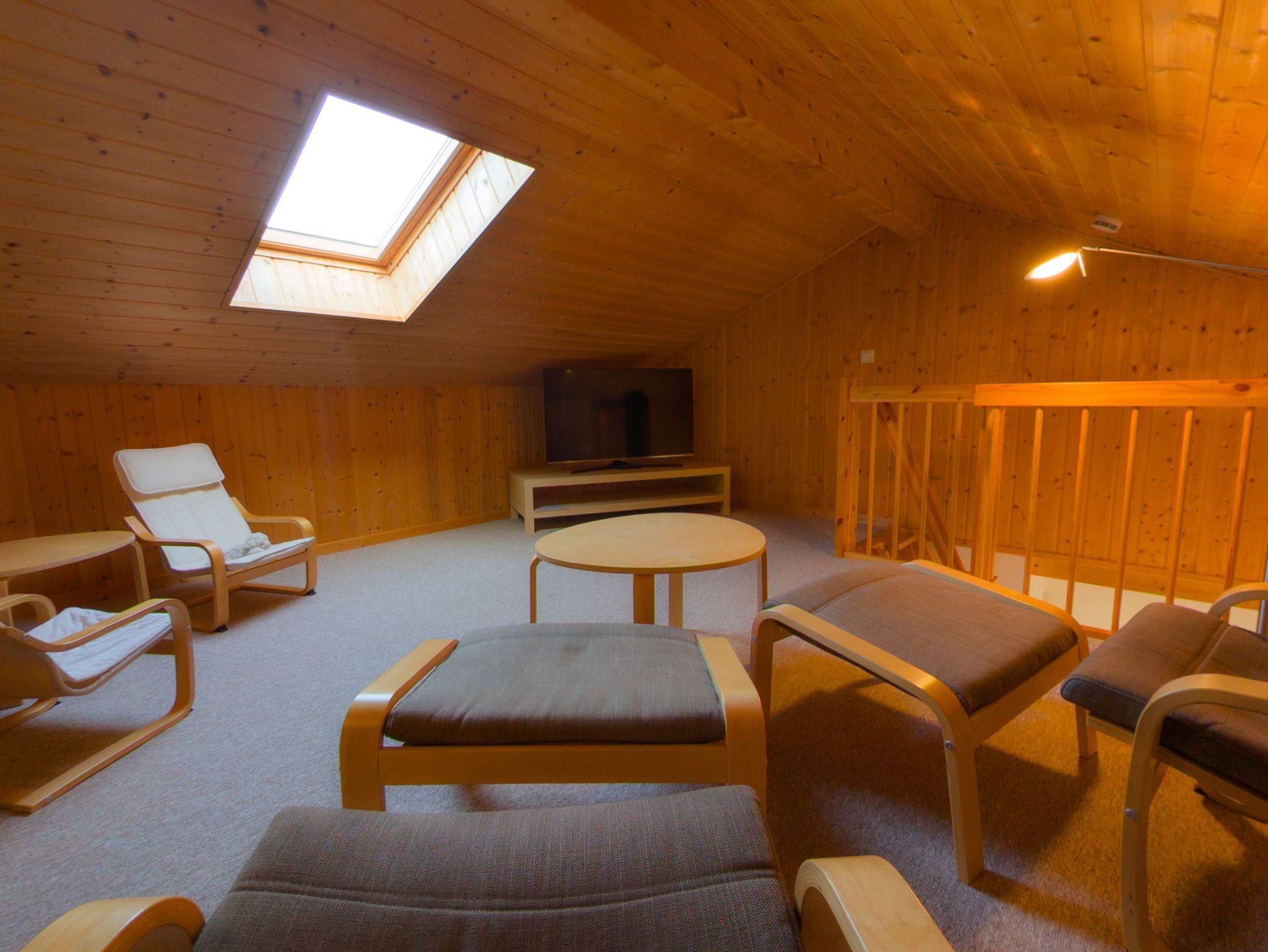 Gemütlicher Wohnraum mit Kaminofen, eine gut ausgestattete Küche mit Essbereich sowie 2 Bäder mit Dusche und WC und 3 Schlafräume (einmal mit Doppelbett, zweimal mit zwei Einzelbetten). Von einem der drei Schlafzimmer führt eine Holztreppe zur 2. Wohnebene auf eine Empore mit einem zweiten Fernseher - ein eigenes kleines Reich für kleine und große Kinder!