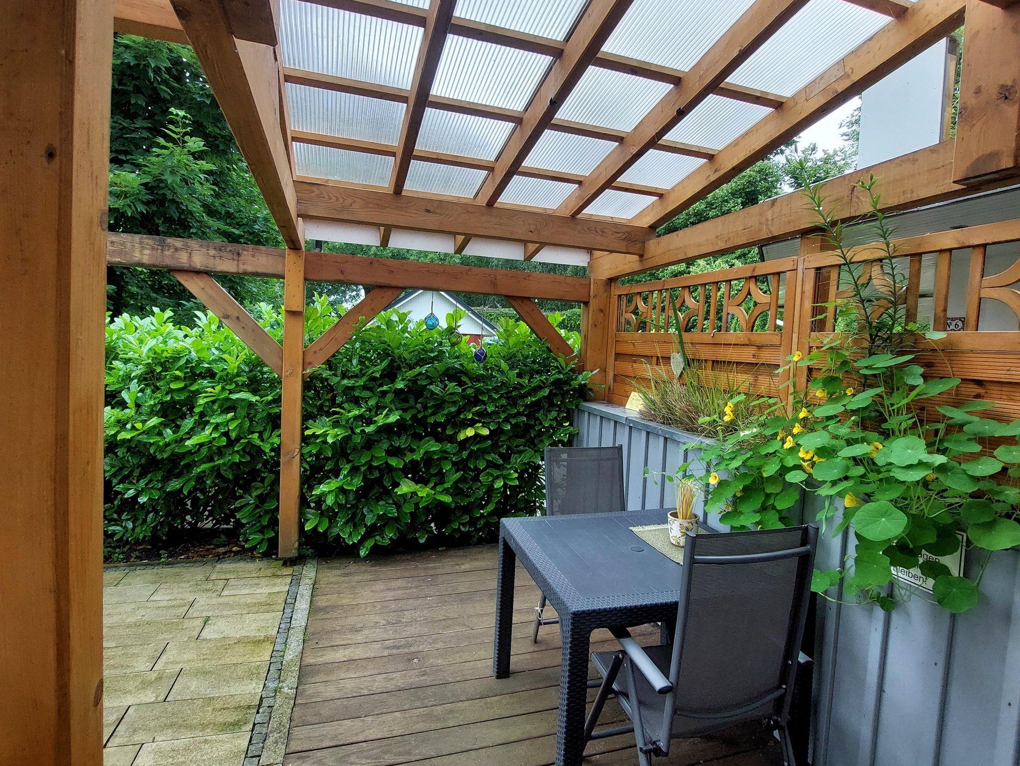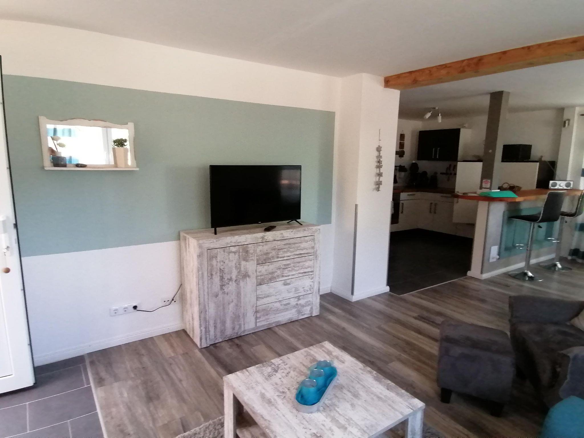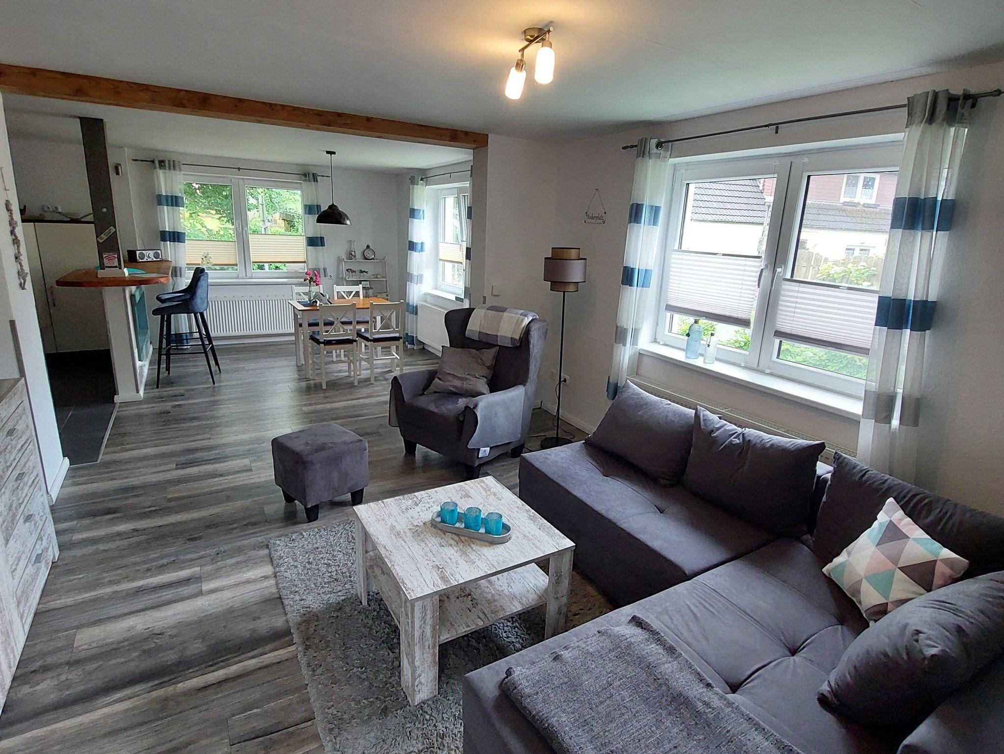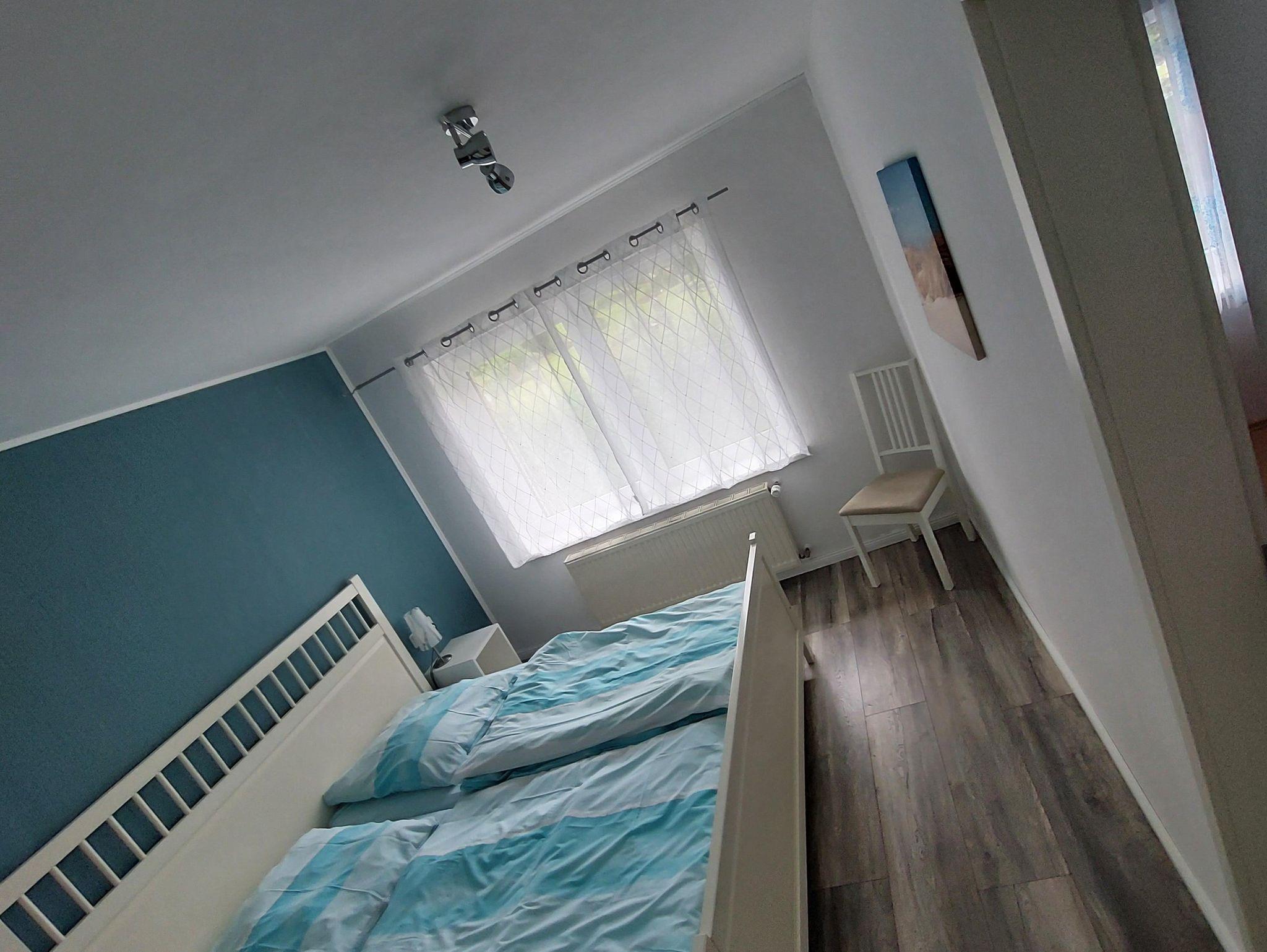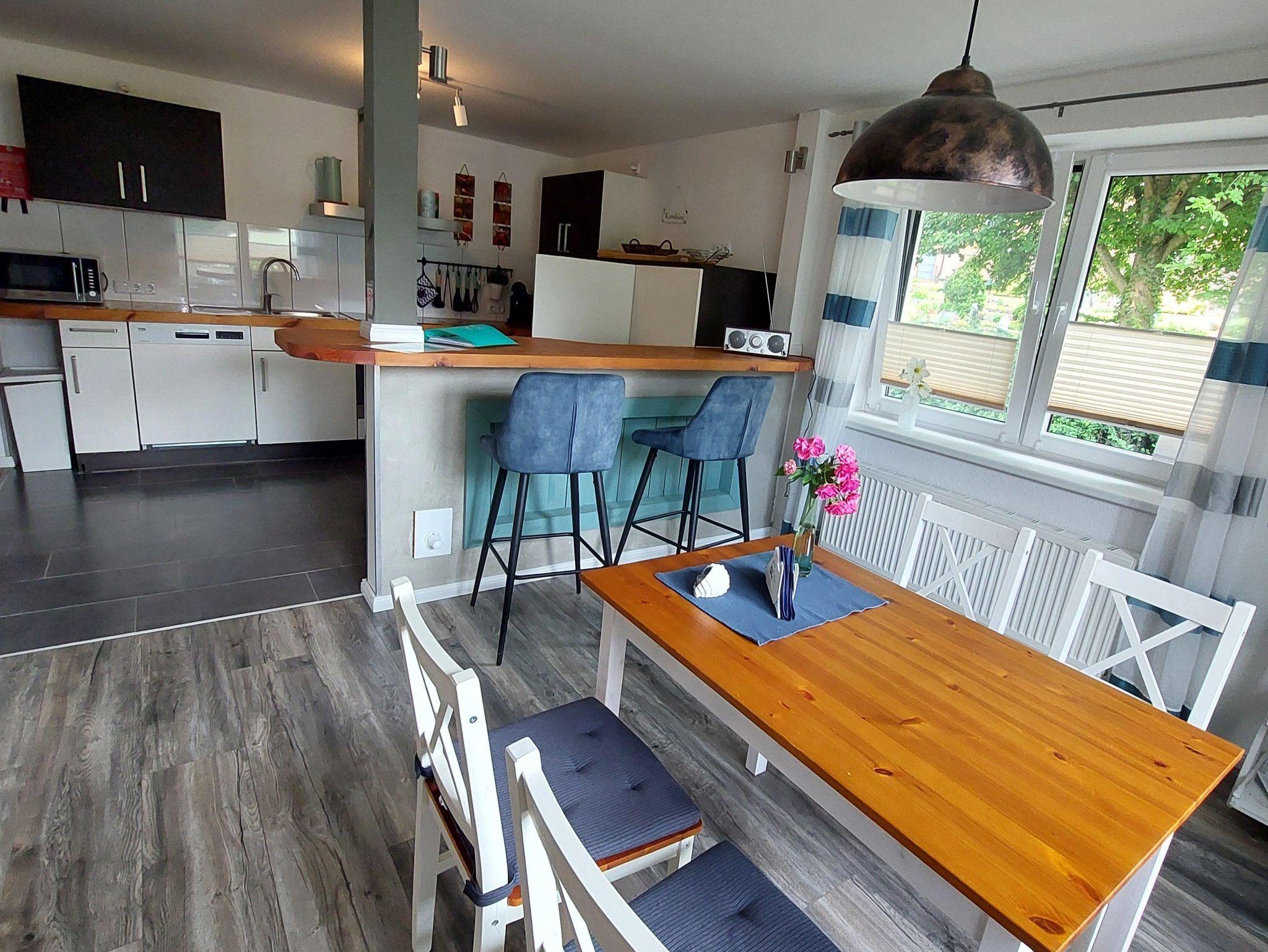 Die gemütliche und helle Ferienwohnung 1 ist ebenerdig, mit einem gemütlichen Wohn-, Kochbereich, mit Wohnecke, TV, Essecke und einer vollausgestatteten Küchenzeile (mit Geschirrspüler, Kühlschrank, Backofen, Herd, Kaffee -und Kaffeepadmaschine, Wasserkocher und Toaster). Ein Doppelzimmer und ein zusätzliches Zweibettzimmer mit einem Etagenbett laden zu einem erholsamen Schlaf in Ihrem Urlaub ein. Ein Bad mit Fön, Dusche, WC und Waschtisch steht Ihnen zur Verfügung. Direkt vor dem Eingang finden Sie eine überdachte Terrasse und eine durch eine Hecke geschützte Liegewiese, wo Sie die schönen Urlaubstage genießen und ausklingen lassen können.