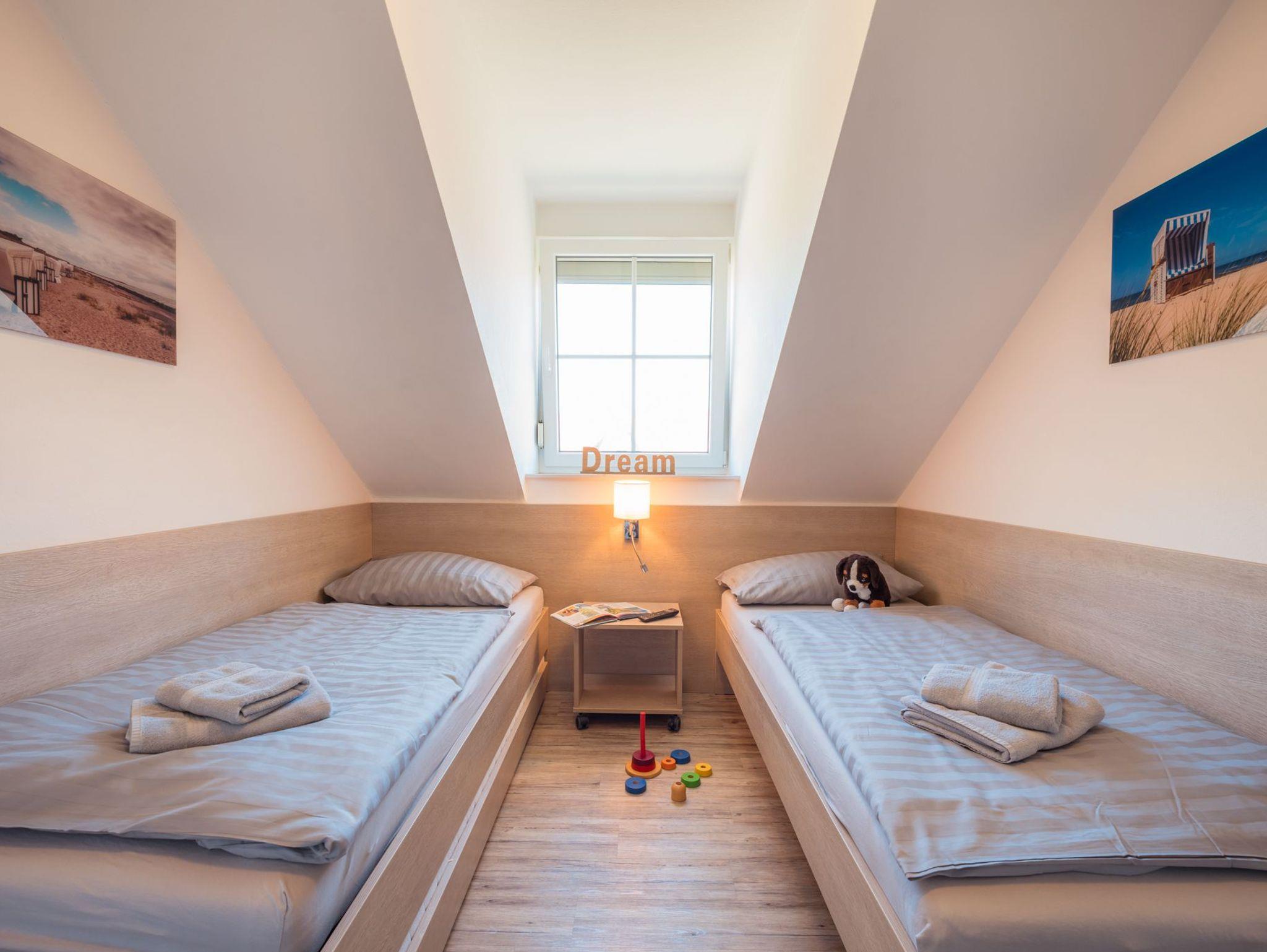 ein Schlafraum mit zwei Einzelbetten und einem Ausziehbett am Boden, 32HD-TV
