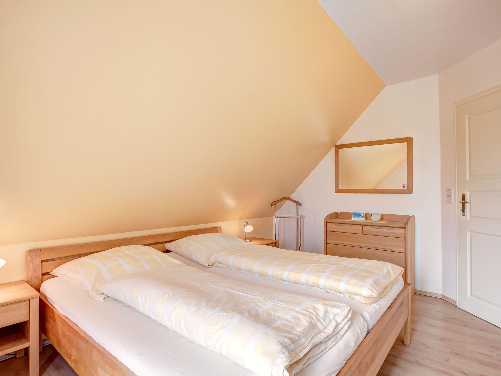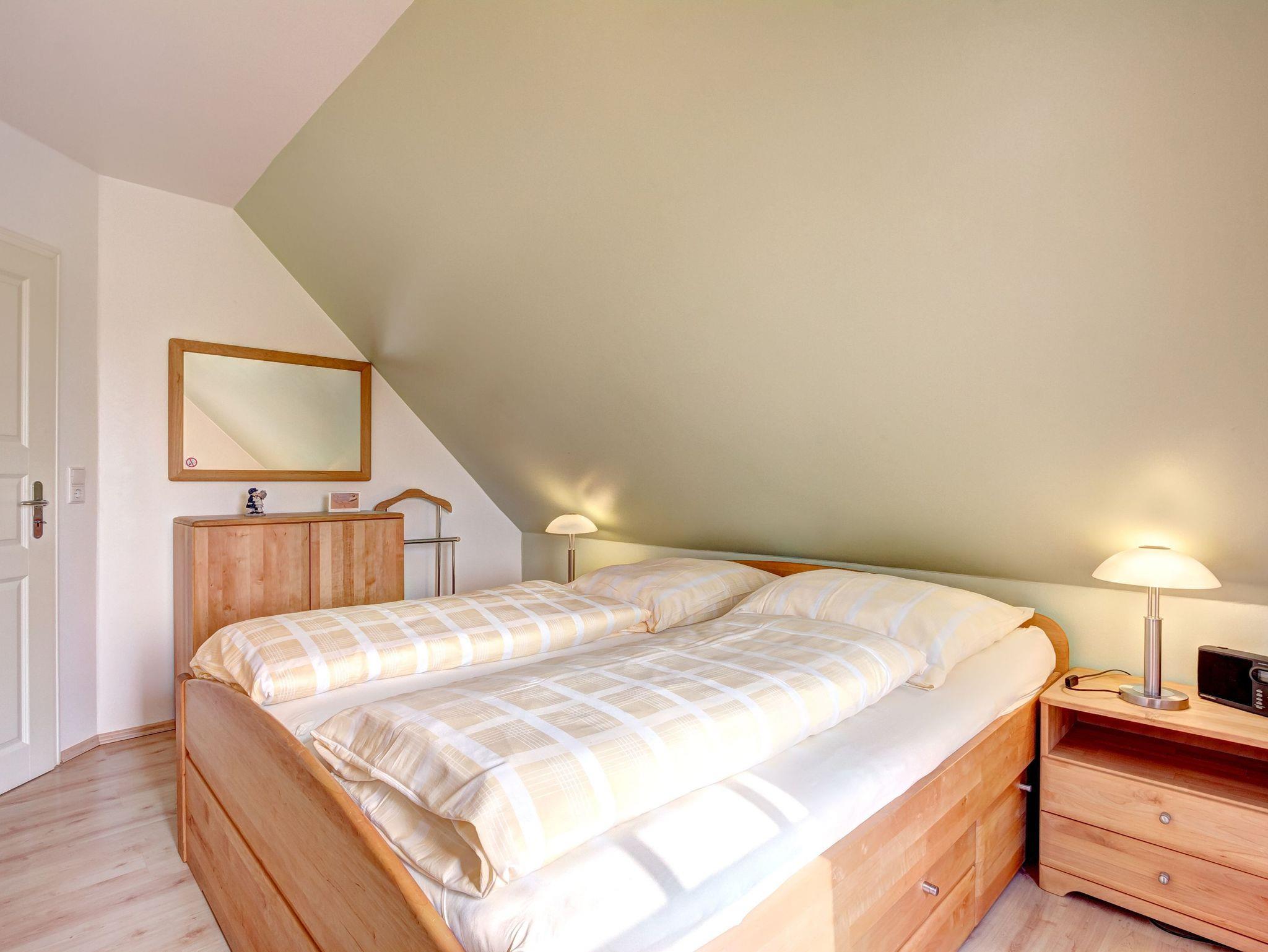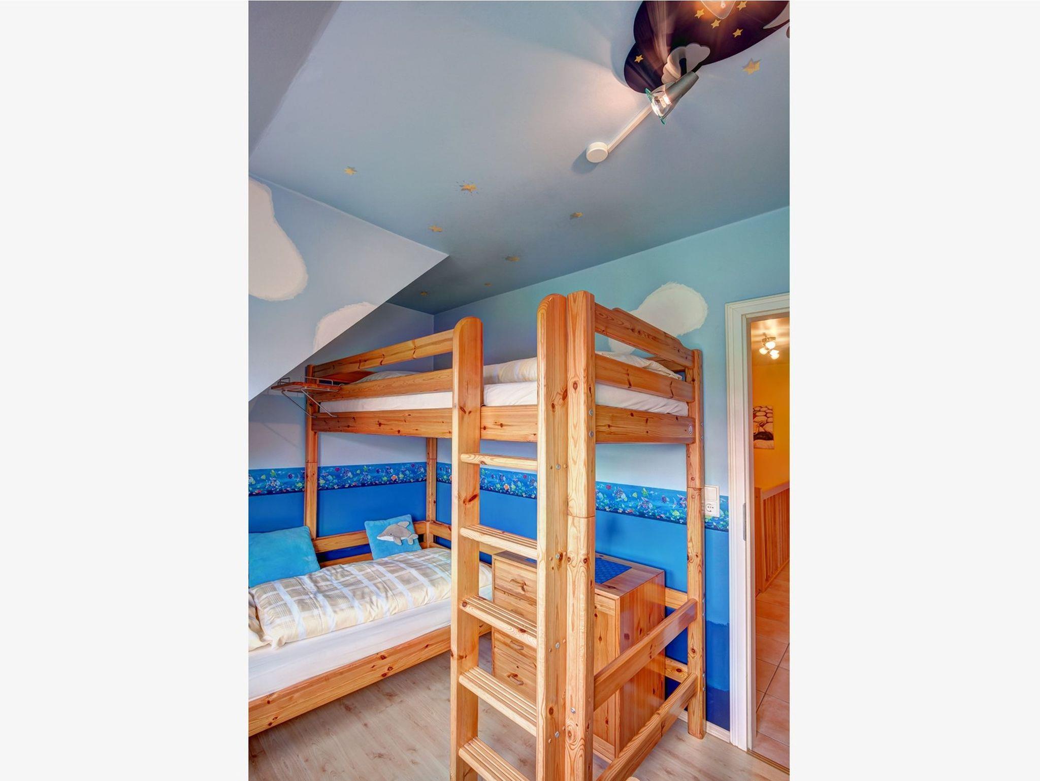 Über eine Holztreppe erreichen Sie das Obergeschoss des Ferienhauses. Hier befinden sich die drei Schlafzimmer: zwei davon mit bequemen Doppelbetten und ausreichend Verstauraum für Ihre Habseligkeiten. Das dritte Schlafzimmer ist das Kinderzimmer mit Büchern, einem Schreibtisch und zwei Einzelbetten.