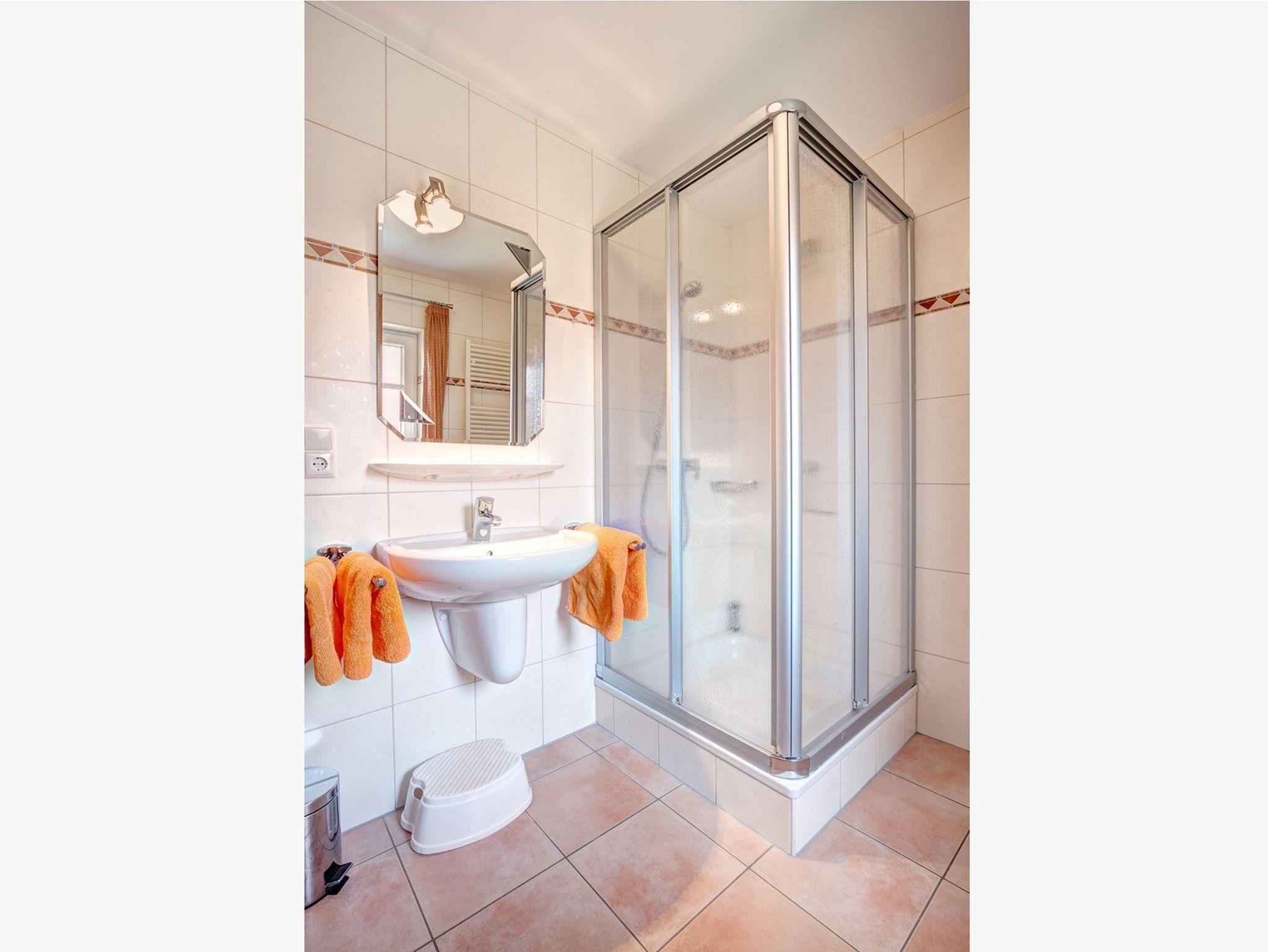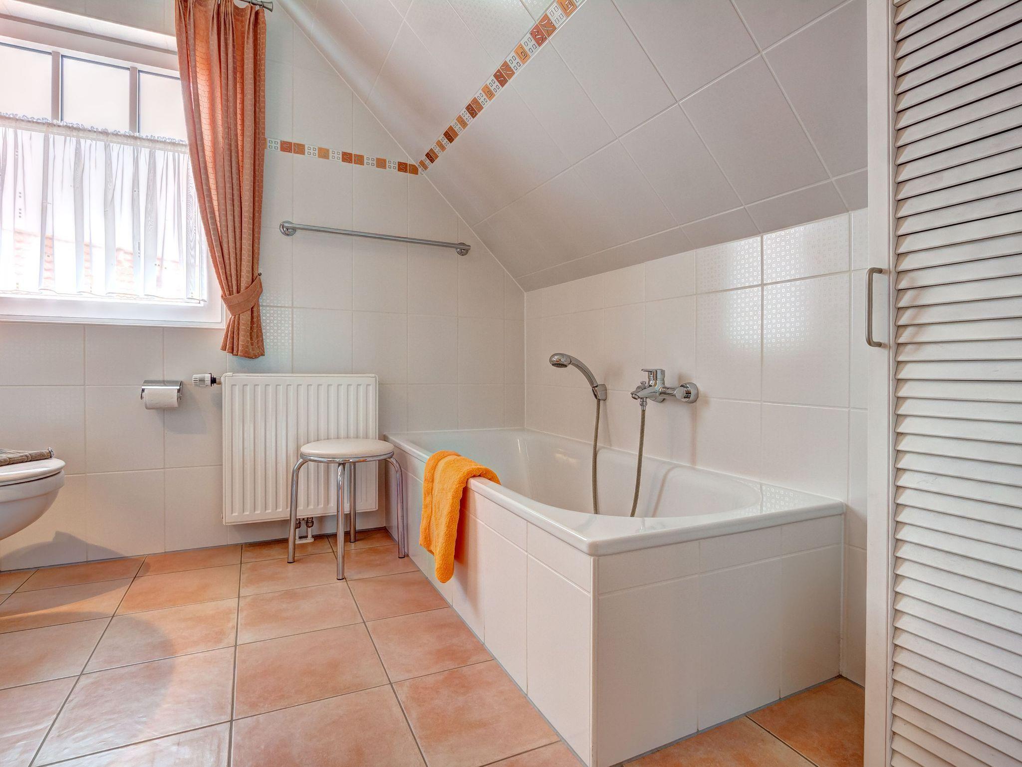 Das zweite Badezimmer mit Badewanne, Dusche, WC und Waschbecken befindet sich ebenfalls im Obergeschoss.