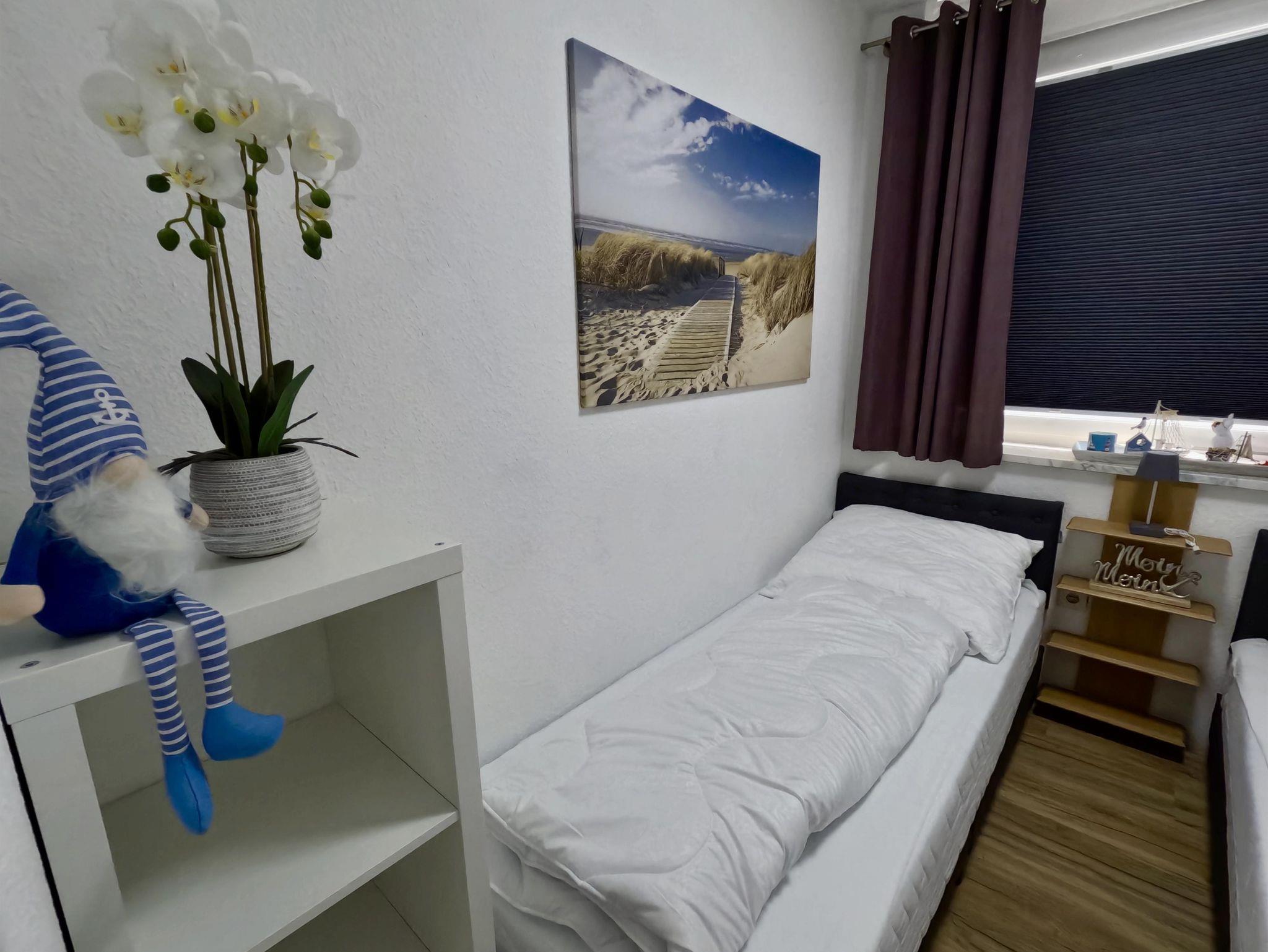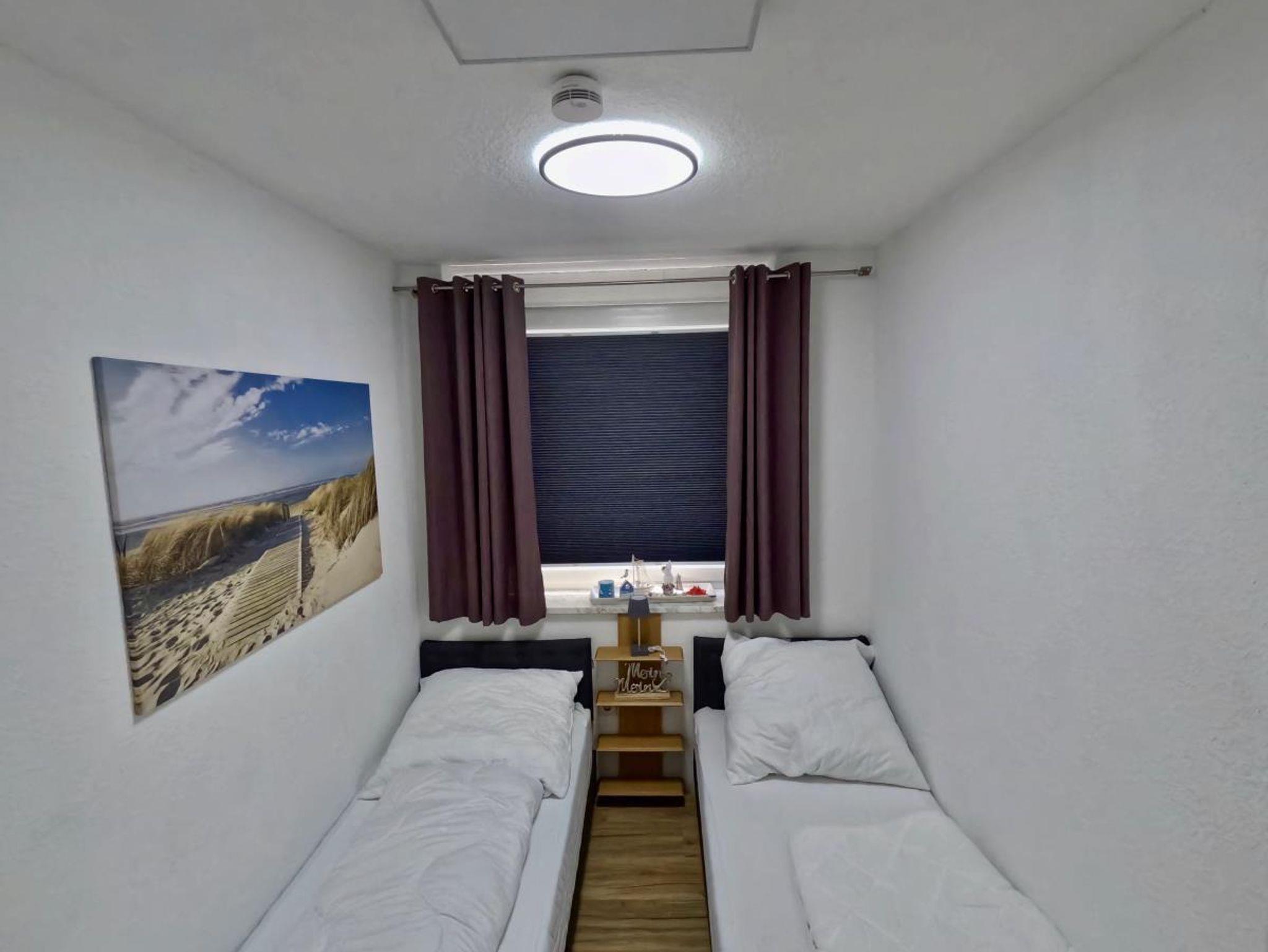 ideal für erholsamen Schlaf nach aktiven Tagen an der Nordsee. Ein großes Fenster mit Verdunkelungsplissee und Insektenschutz sorgt für angenehmes