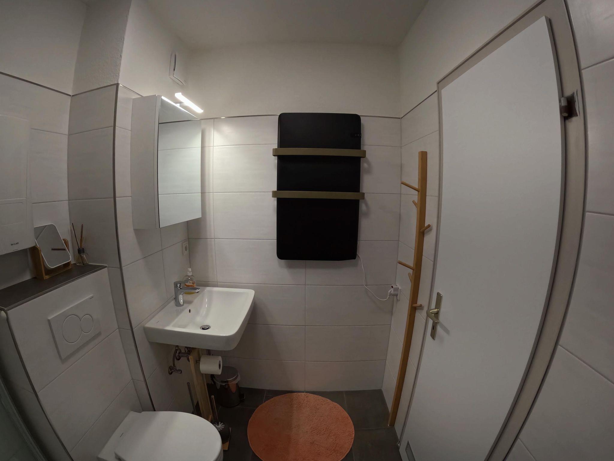 Das moderne Waschbecken mit Einhebelmischer sowie ein leiser Lüfter runden den Komfort ab.