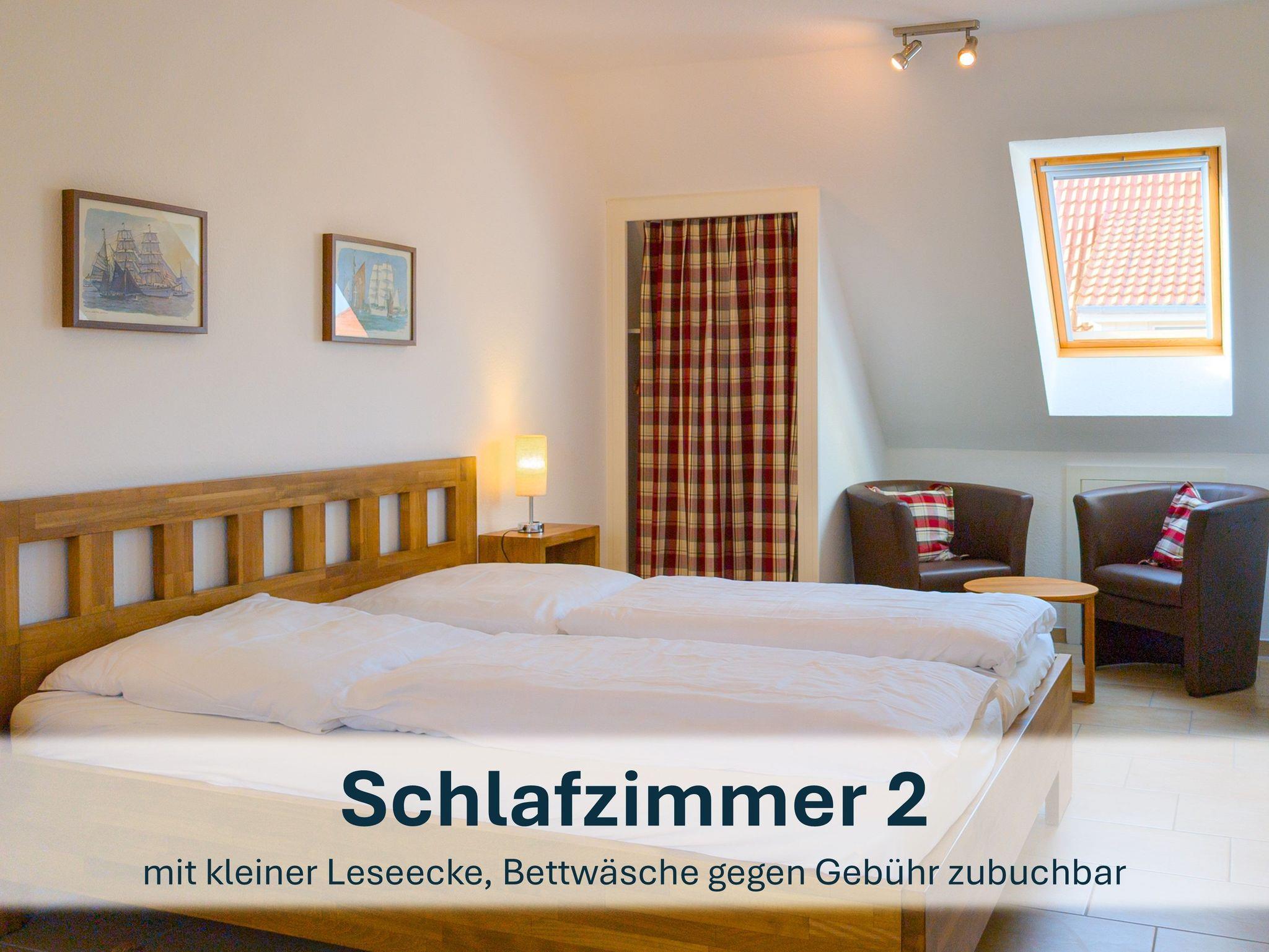 Über die Holztreppe im Flur gelnagen Sie in das Obergeschoss des Hauses.Hier befinden sich zwei weitere Schlafzimmer: ein Kinderzimmer mit zwei Einzelbetten und einem kleinen Schreibtisch, sowie ein Schlafzimmer mit Doppelbett und einer Kommode.