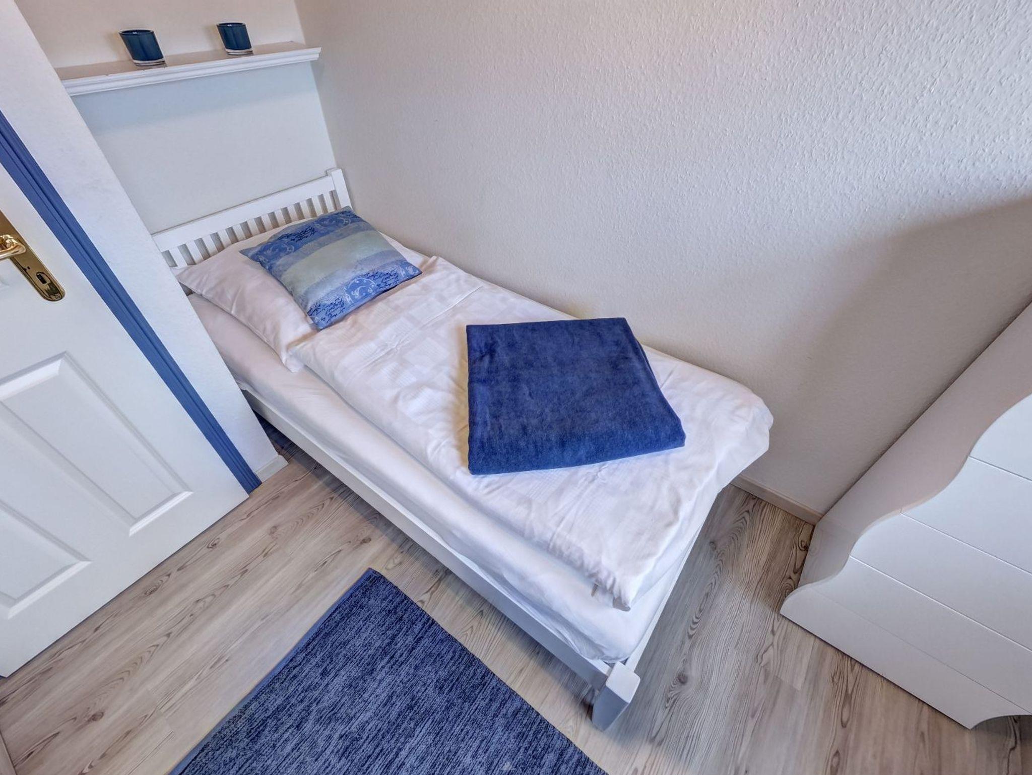 Die Schlafräume finden sich im Oberschoß. Das erste Schlafzimmer verfügt über ein Doppelbett. Im 2. Schlaffzimmer stehen 2 Einzelbetten. Der 3. Schlafraum weist 1 Einzelbett auf. Des Weiteren finden Sie hier oben ein zweites Bad mit Dusche und WC.